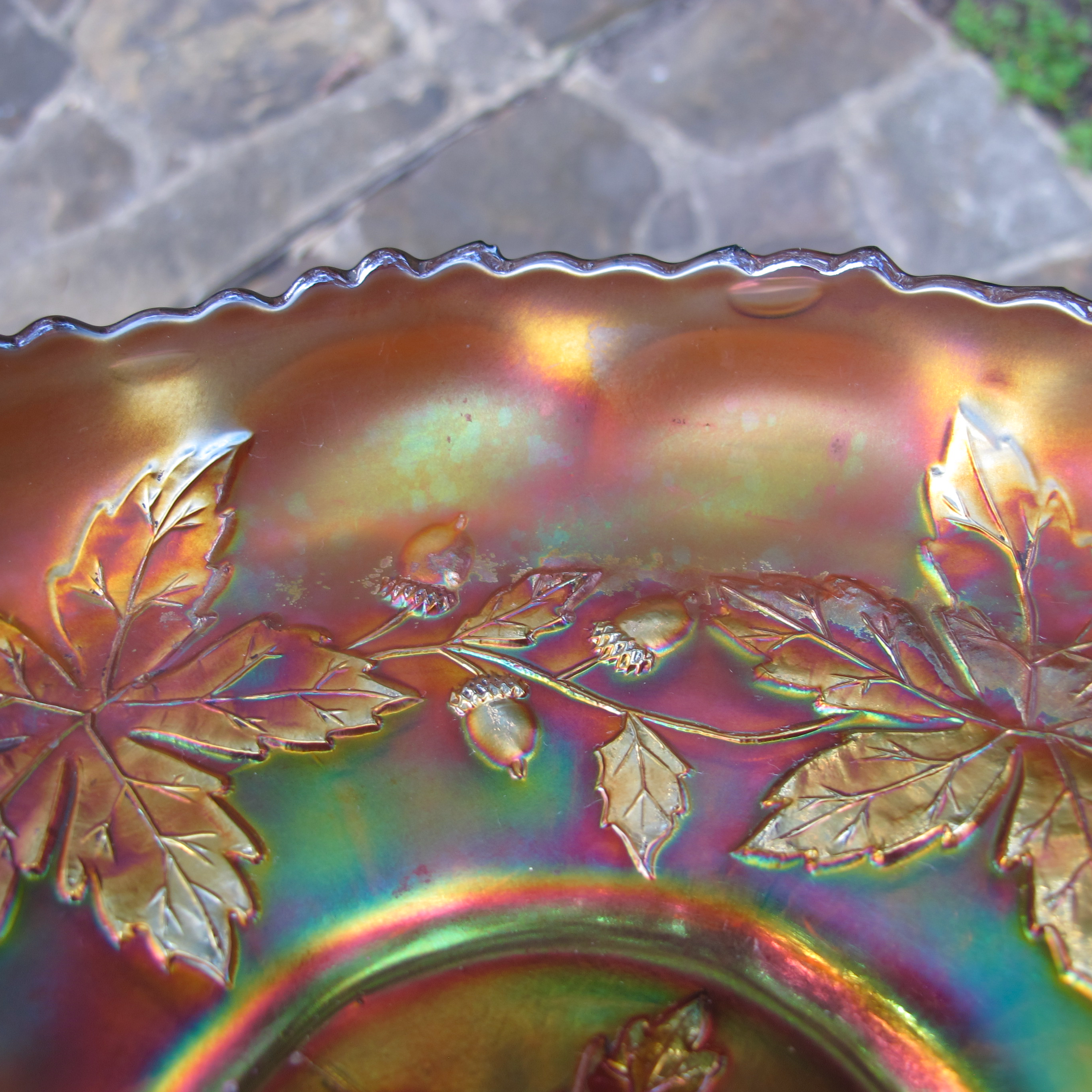 Antique Fenton Autumn Acorns Electric Amethyst Carnival Glass ICS Bowl