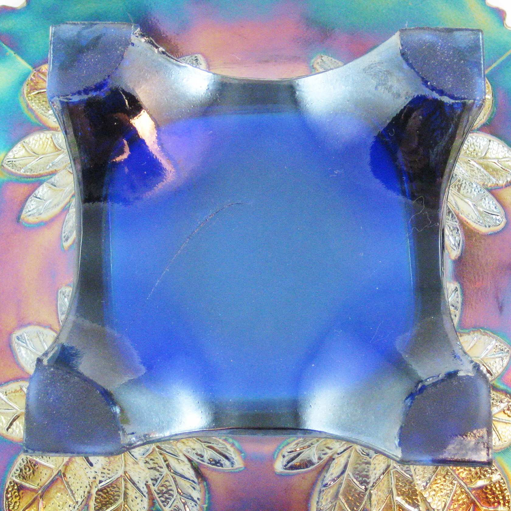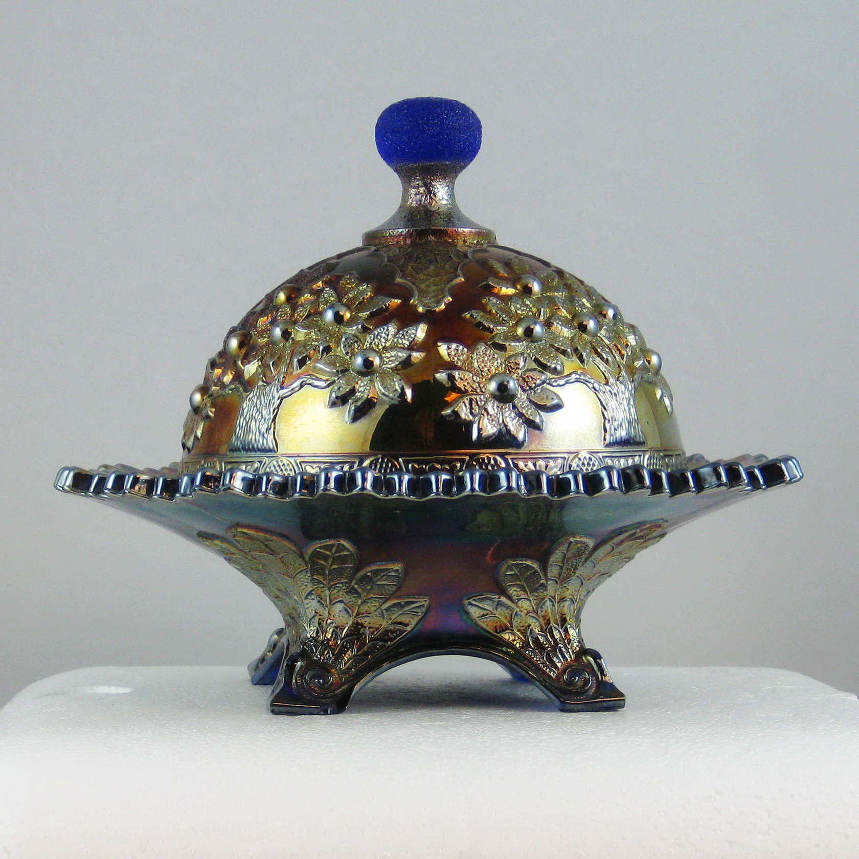 This lovely, hard to find blue Orange Tree Covered Butter Dish is part of the Table Set. This one has a lot of various colors in the iridescence and is just beautiful! You don’t see these very often.