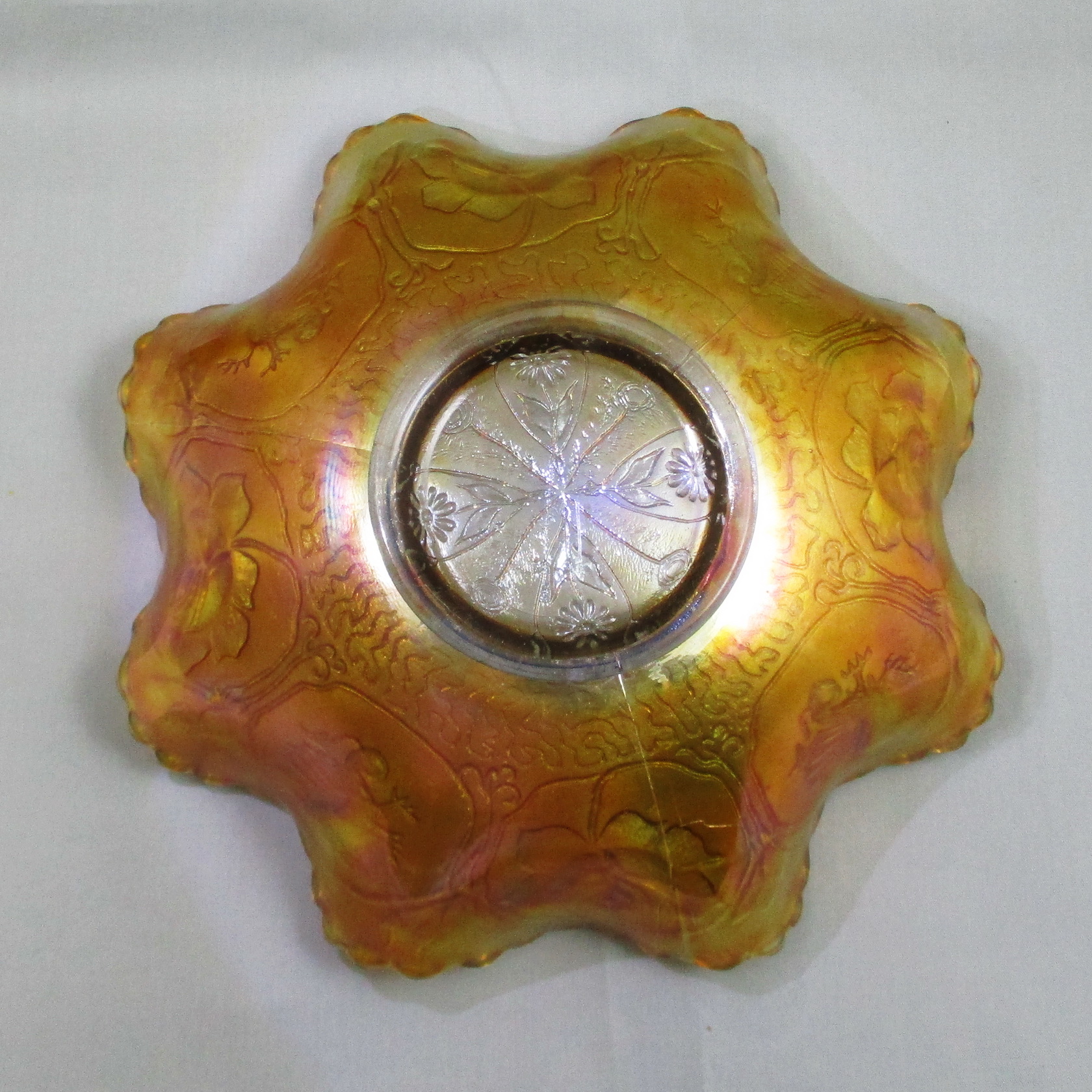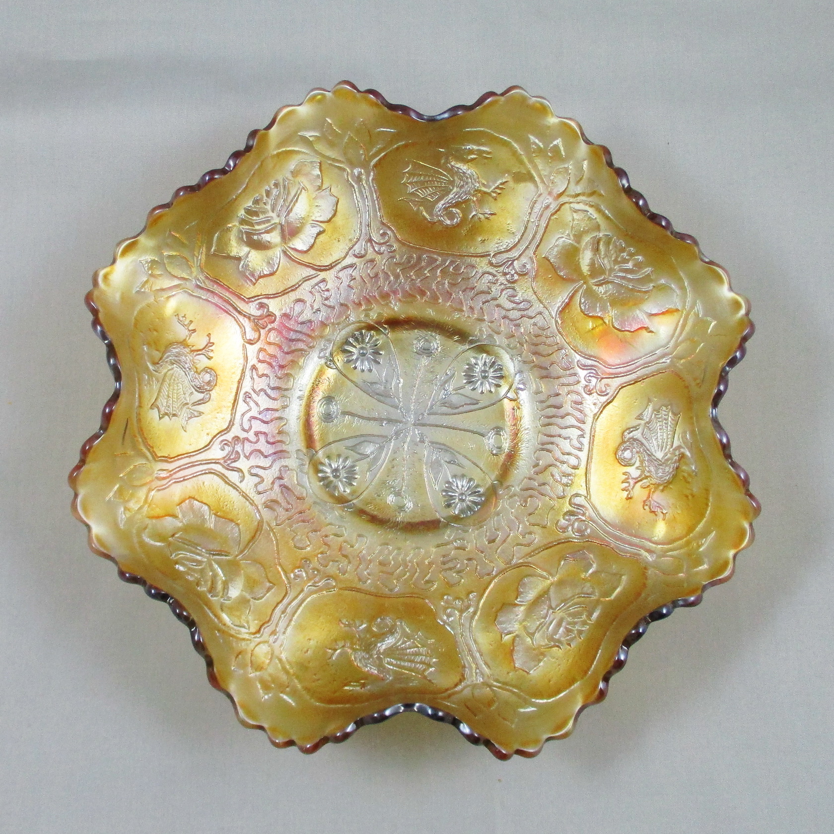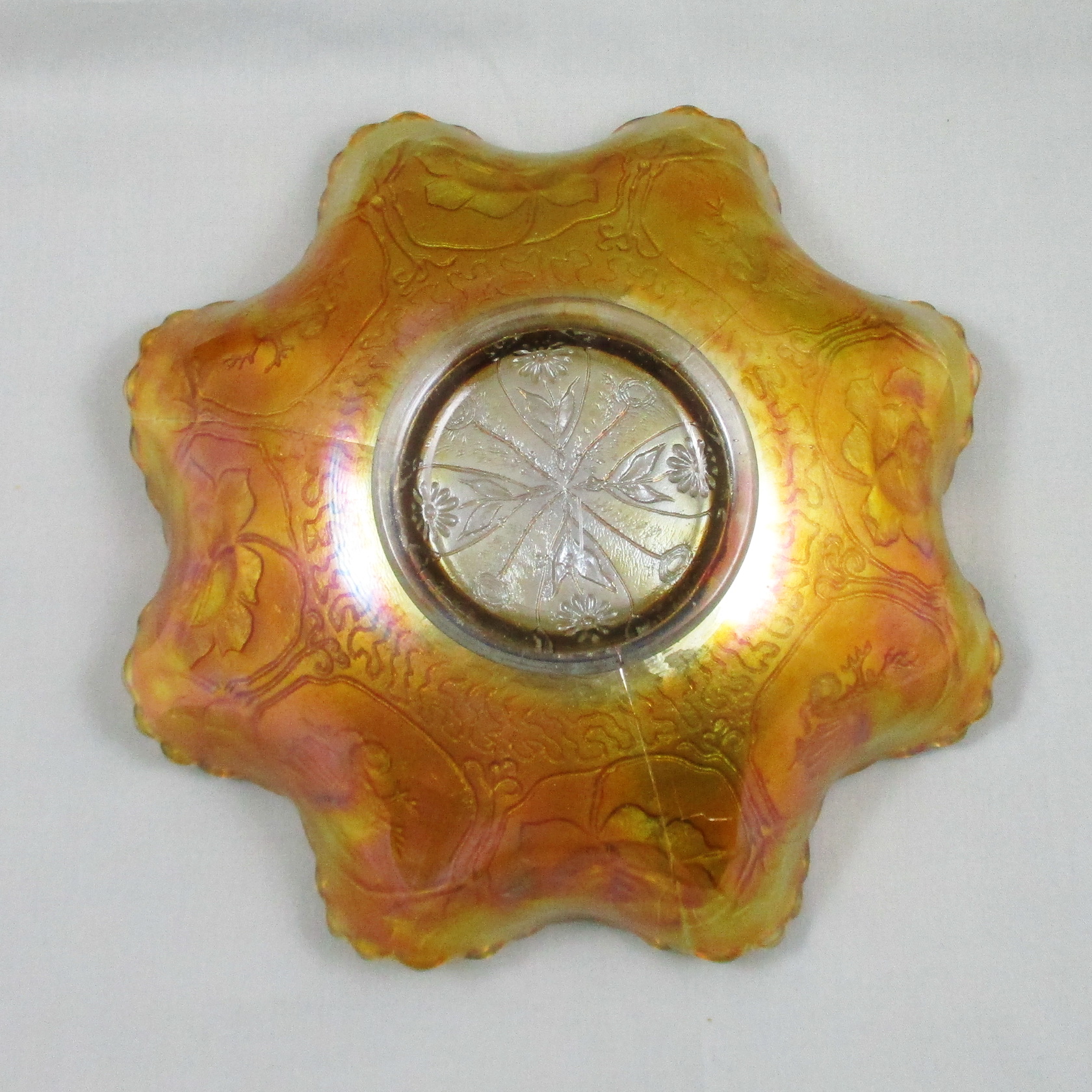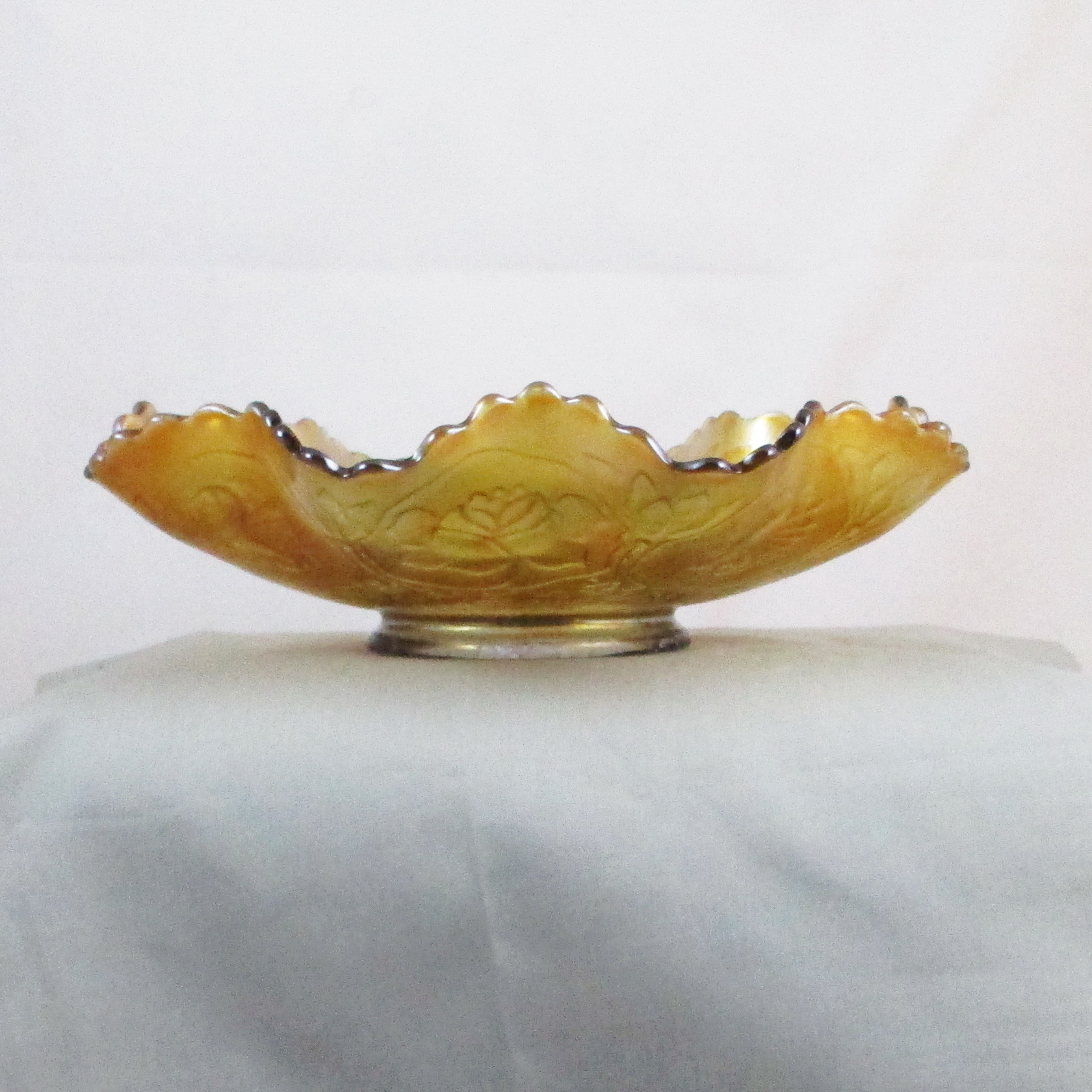 This is an unusual/weird color but no surprise here since Fenton’s DRAGON & LOTUS bowls were made in the most colors of any item IMHO. This bowl is a soft, pale very light blue/smokey color. When in doubt on this color, I use a small 4″ Flashlight to shine on the base…this will bring out the Bluish to pale Lavender color…one of the base photos I have shows this…the other is more of a grayish tint color.