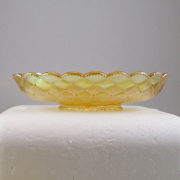 This is Clambroth to me and not Pastel Marigold…if you buy it you can make the call.  Either way, it is an above average iridized Oval Bowl.  The PANSY interior is backed by a QUILTED pattern.  And the iridescent colors are lots of Yellow with some Blue & Magenta. This was made by Imperial Glass company as their Pattern #478.