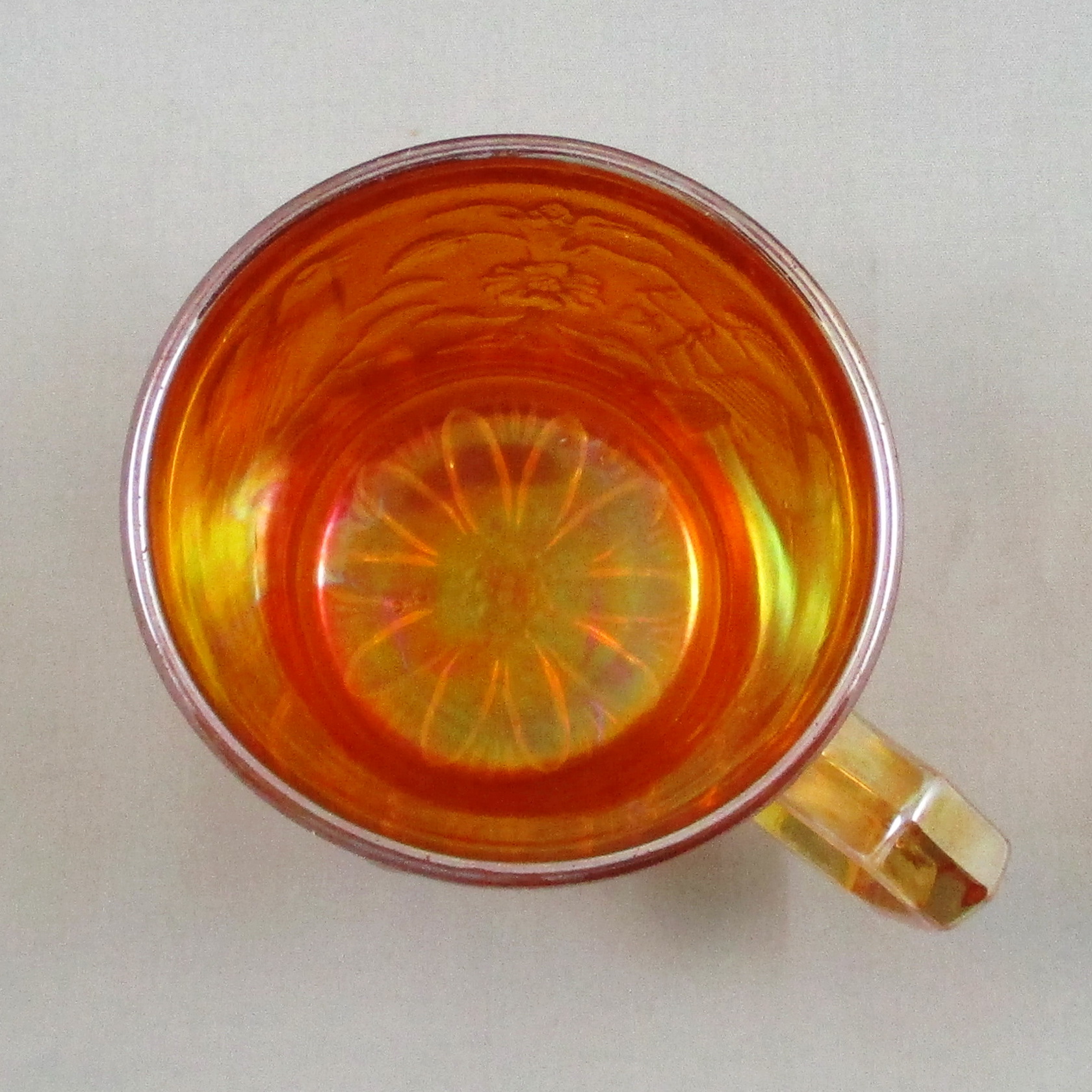 This is an Imperial ROBIN Handled Mug in Marigold.  It is typical for these.  Nice Marigold.  The base flower shows iridescence from the interior.