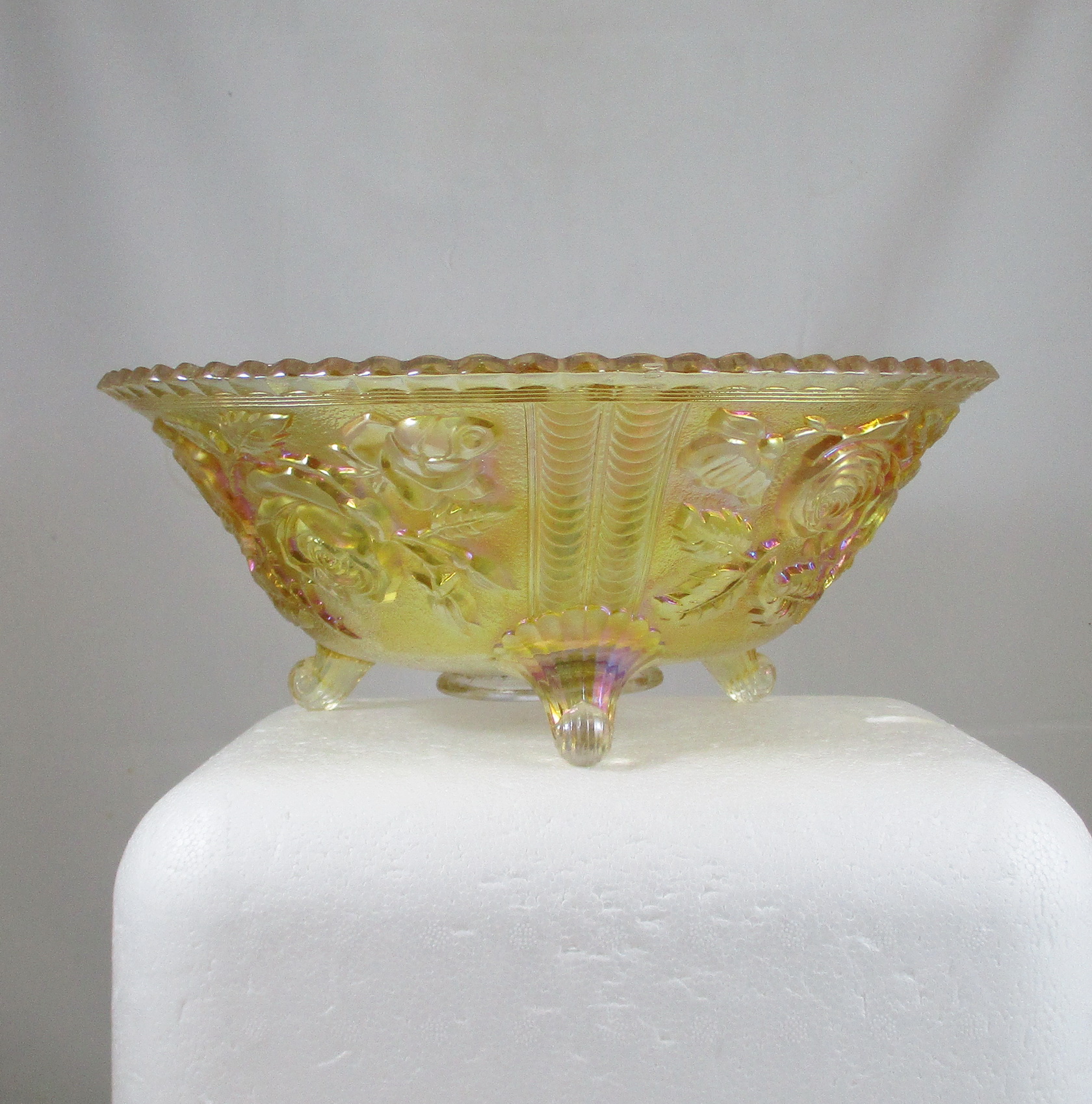 Imperial’s pattern #489, LUSTRE ROSE Fruit Bowl in Marigold Carnival Glass. This is the Round, Flared version of this Large Scroll Footed Bowl. This one has lots of Pastel Iridescent Colors…I have a photo on a black background so you can see the colors Pop.