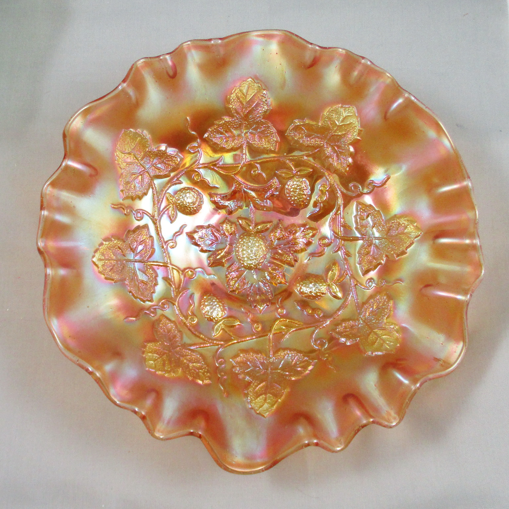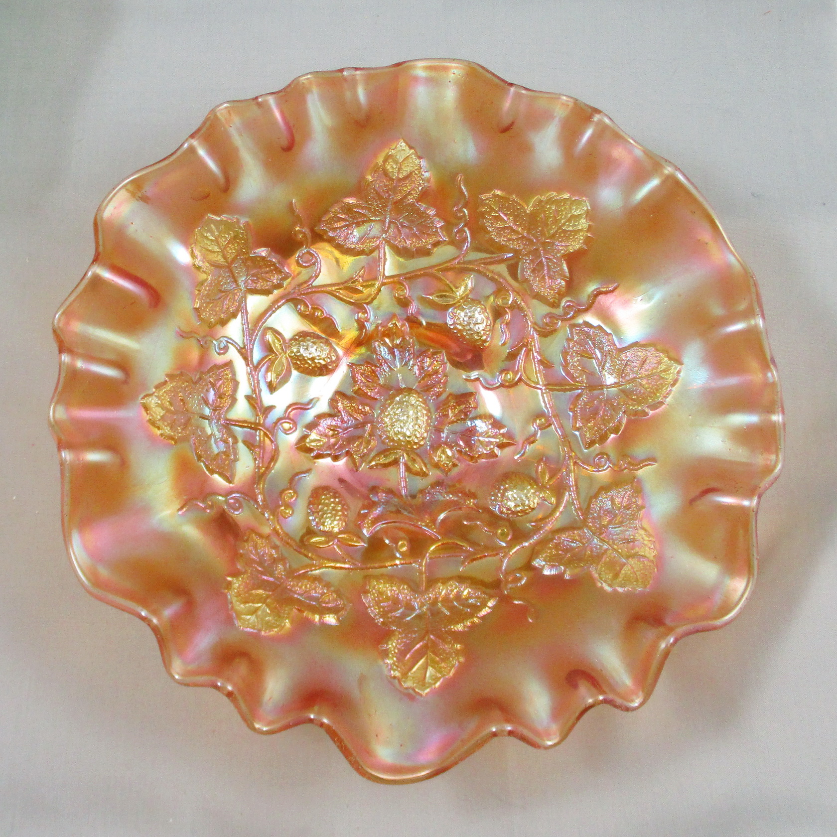 Millersburg BLACKBERRY WREATH in Marigold Glass.  This one has the Three In One edge shape and a WIDE PANEL exterior.  The iridescence on this is so pretty…soft magenta, green, yellows!