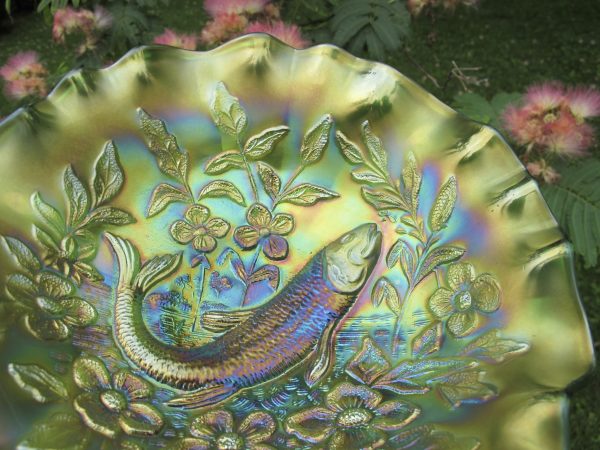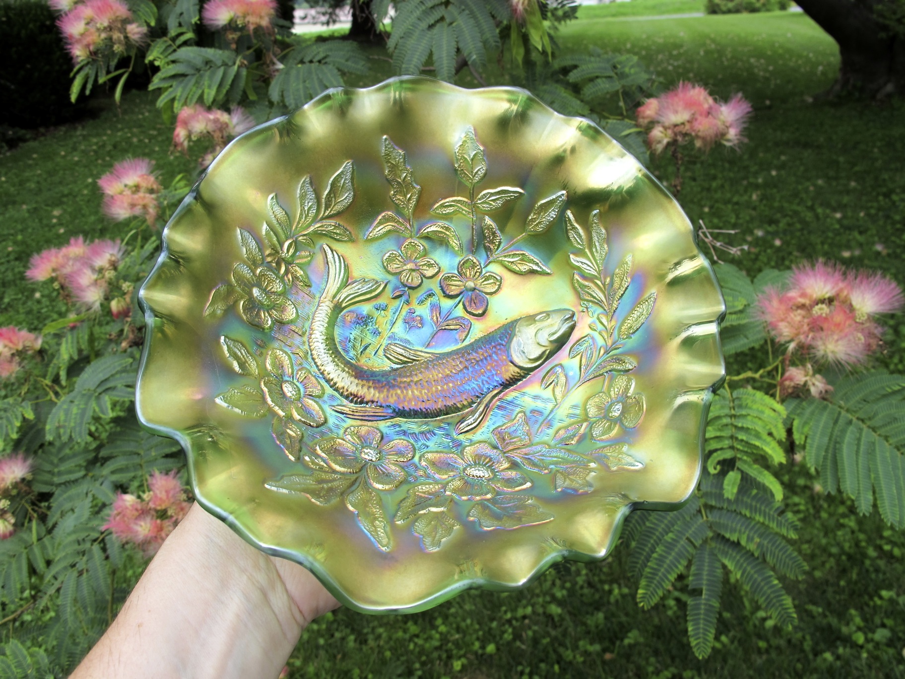 Antique Millersburg Green Trout & Fly Carnival Glass 3N1 Bowl