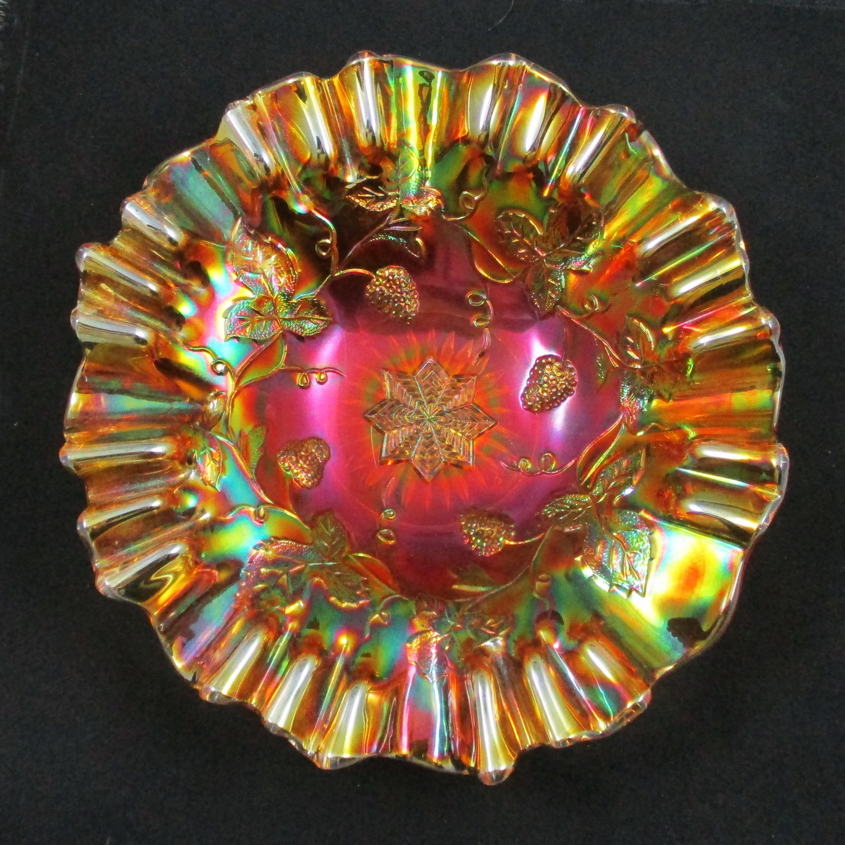 This Millersburg Bowl is in the GRAPE WREATH pattern with an Eight Point Star in the center and a Three In One edge treatment. The exterior has the Wide Panel pattern and is not iridized.