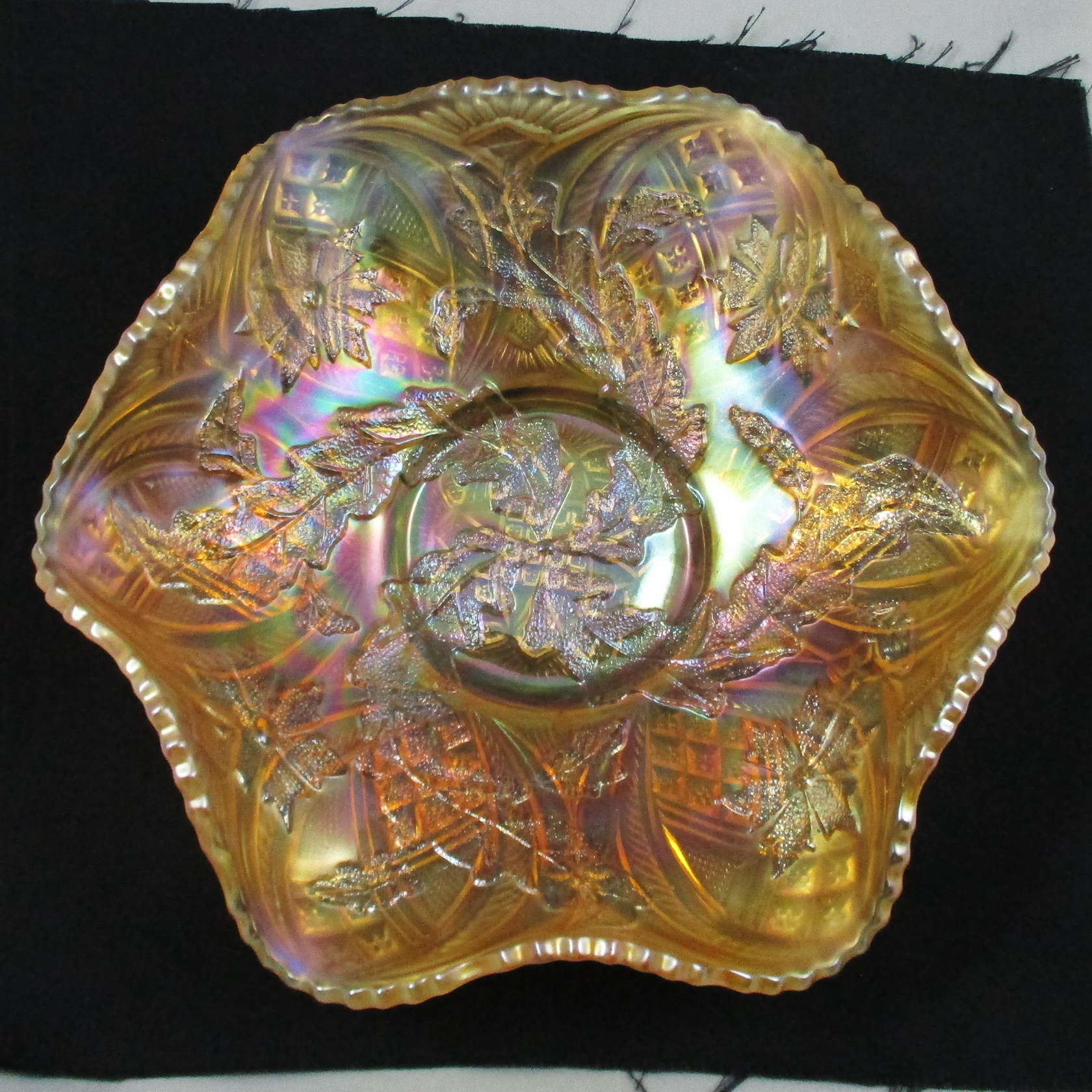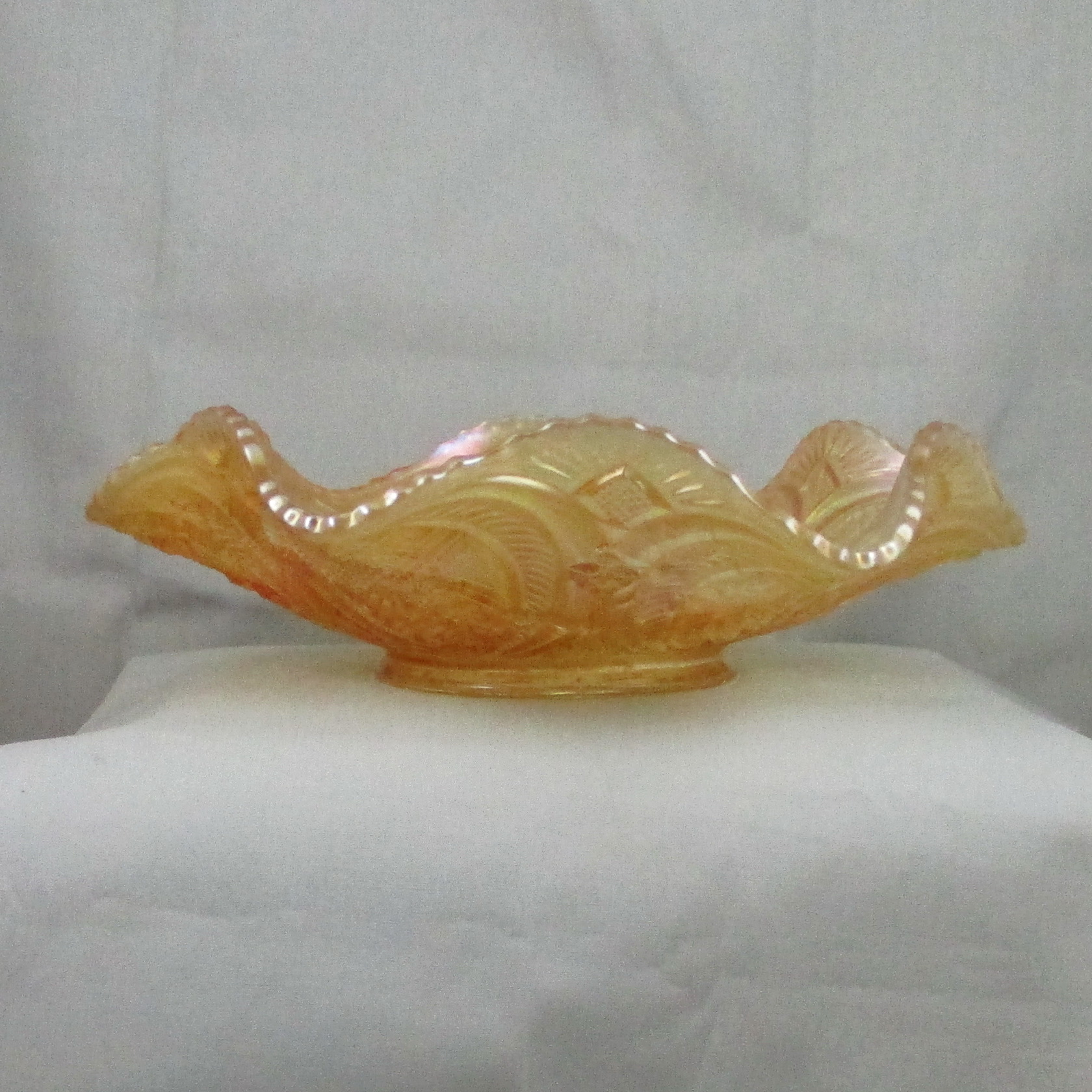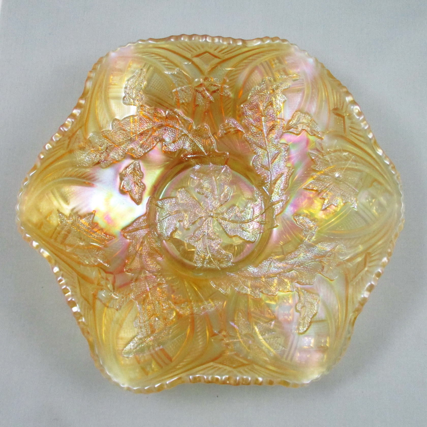 This is a beauty, one of the better I’ve seen in marigold… very light too… but a bit too dark to call pastel!  This is a Whirling Leaves bowl made by Millersburg Glass of Ohio.