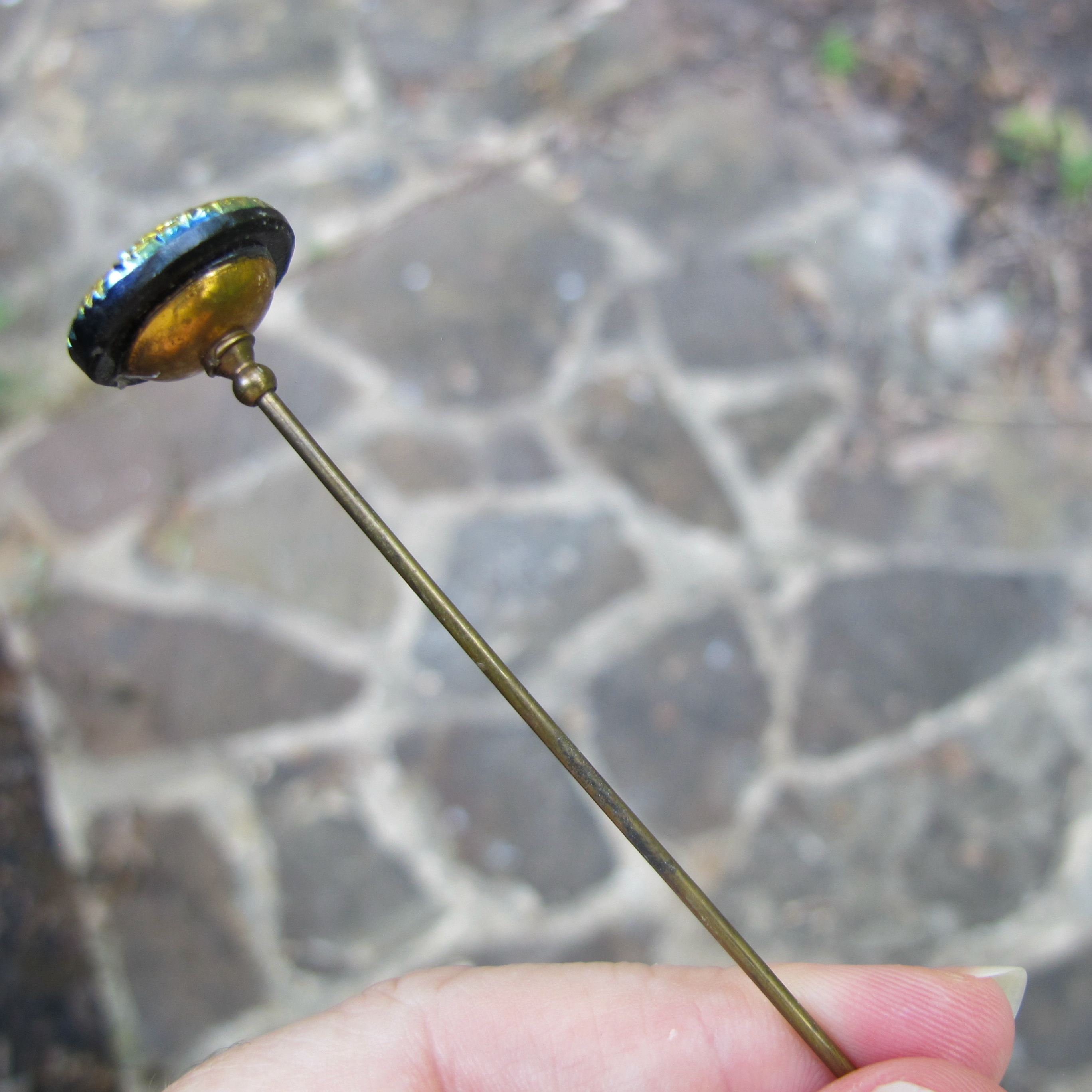 Given the size of the top, I suspect this was a button in its past life… it’s on a 8 inch pin so it will look great in your hatpin holder!