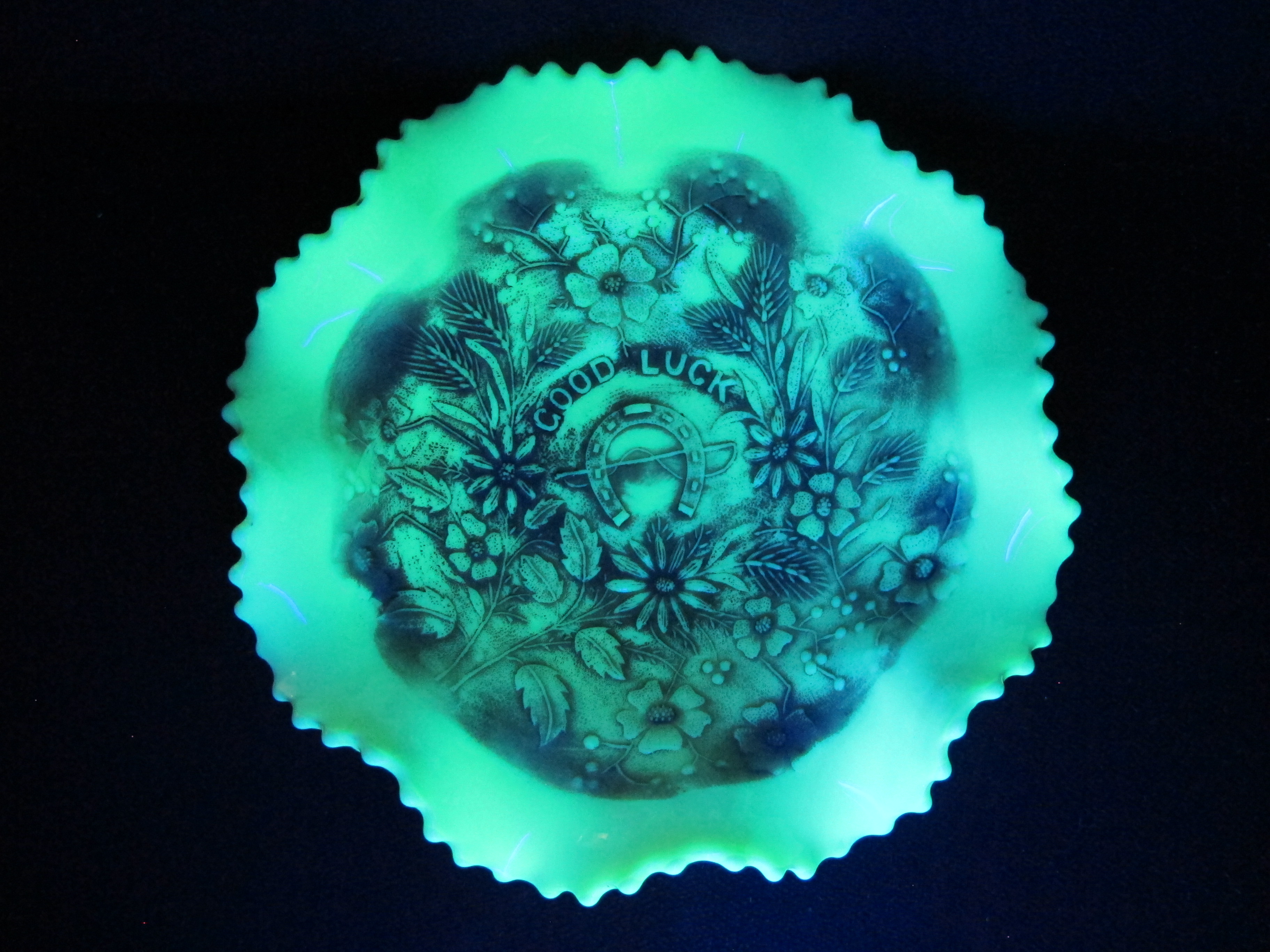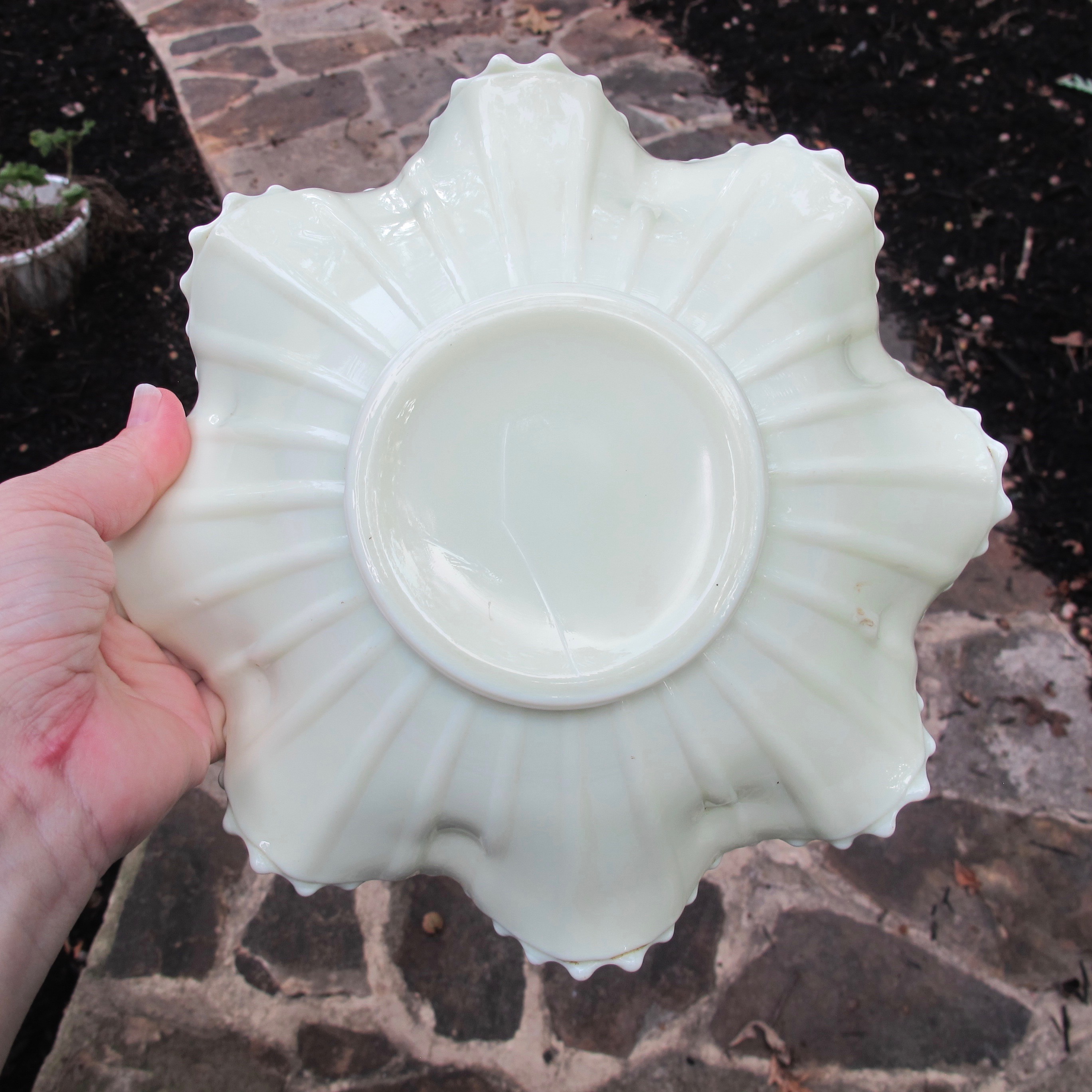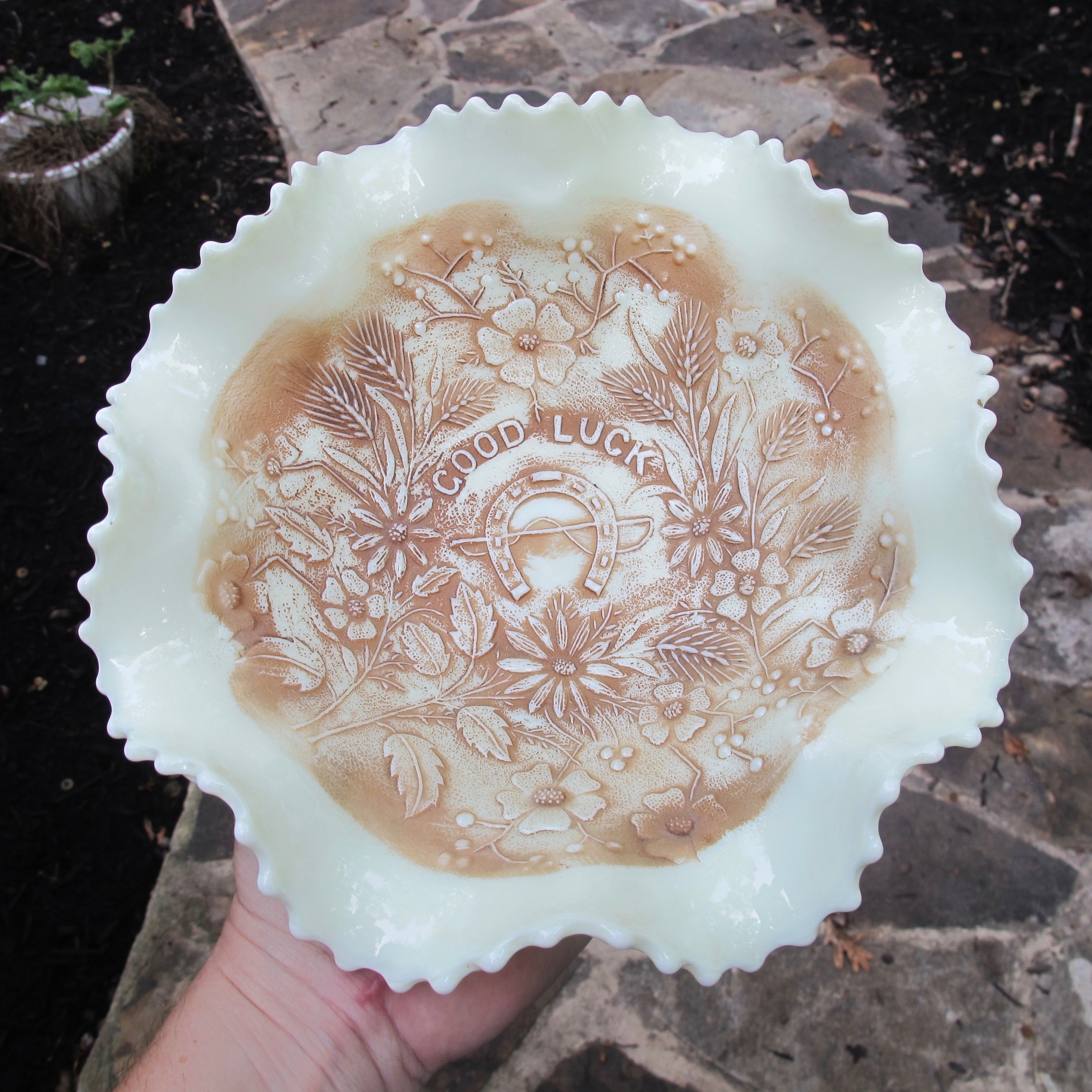 Here is a custard, STIPPLED Good luck bowl with excellent nutmeg stain!! You just don’t see these!  Look it up! It is no slacker piece of antique glass!  This is not iridescent… it is not carnival glass… it is Northwood made custard glass which predates the carnival!