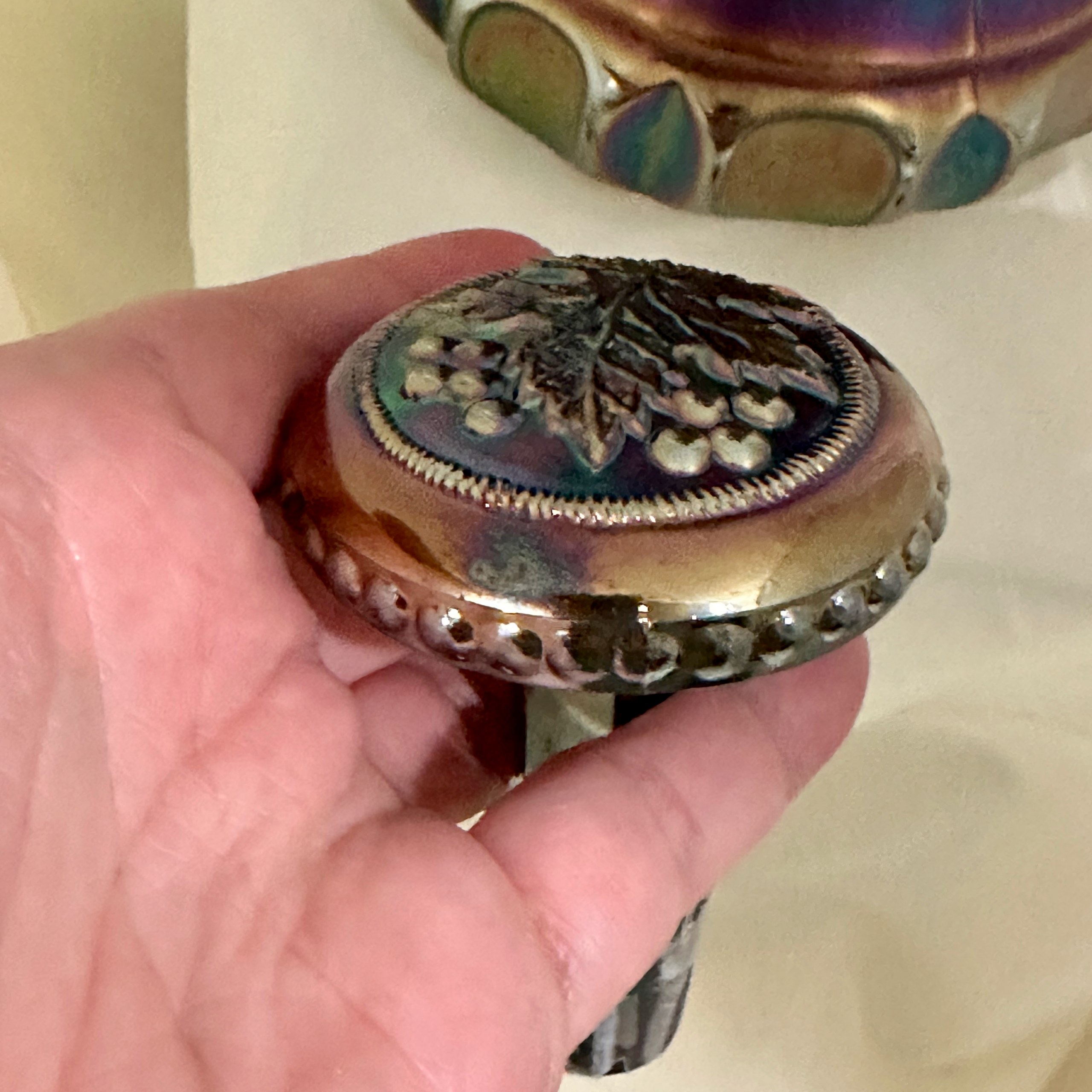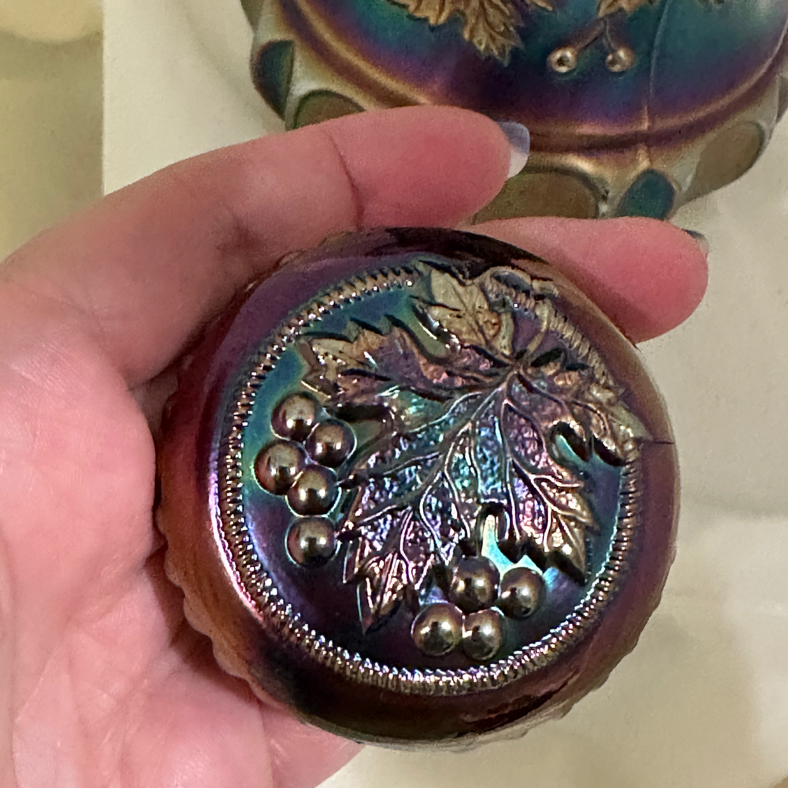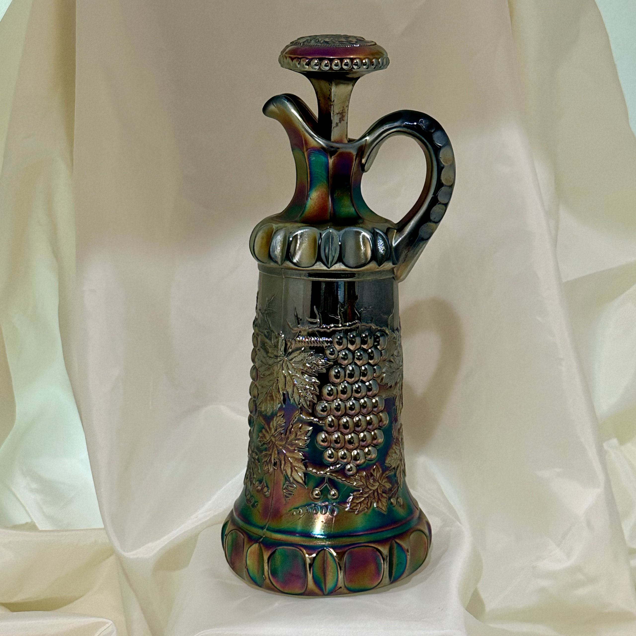 This is the only one of these I have owned. It’s a Northwood carnival glass whiskey decanter! How cool is this?! From the early 1900s. Classic grape & cable pattern here.