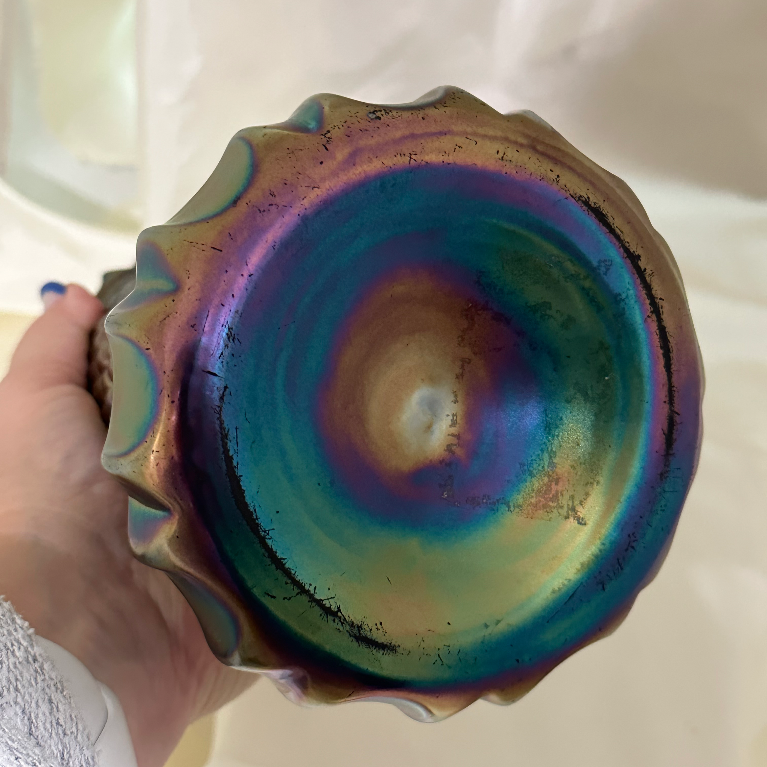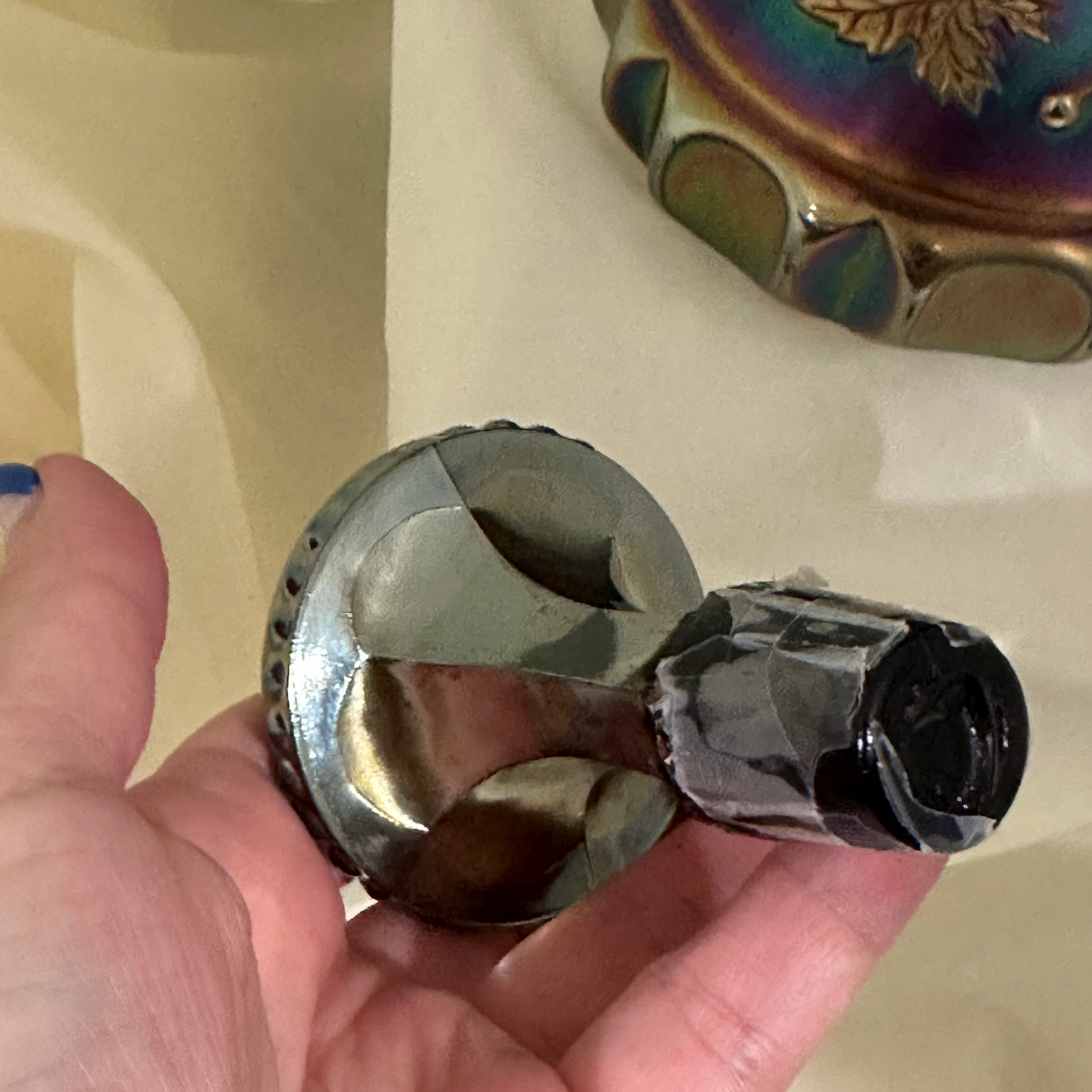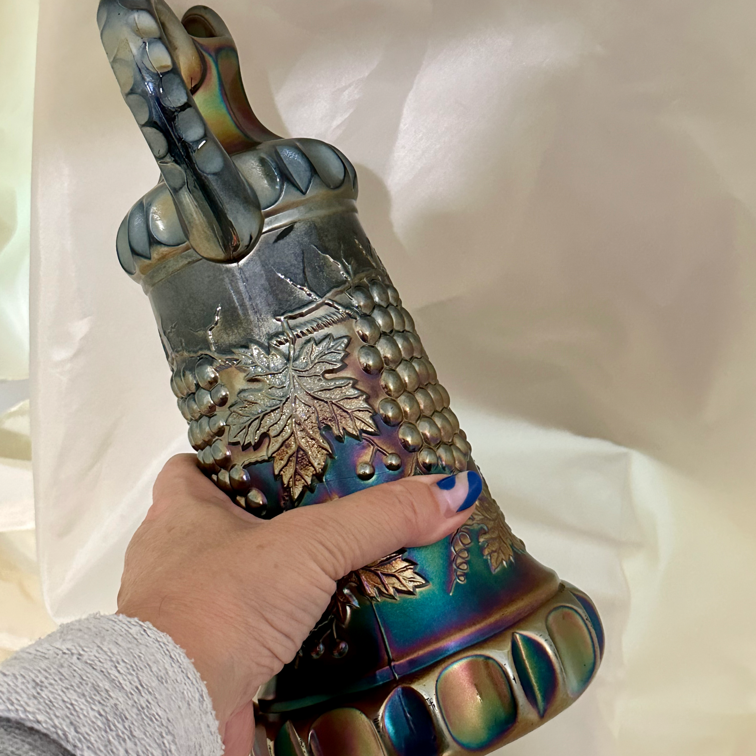 This is the only one of these I have owned. It’s a Northwood carnival glass whiskey decanter! How cool is this?! From the early 1900s. Classic grape & cable pattern here.