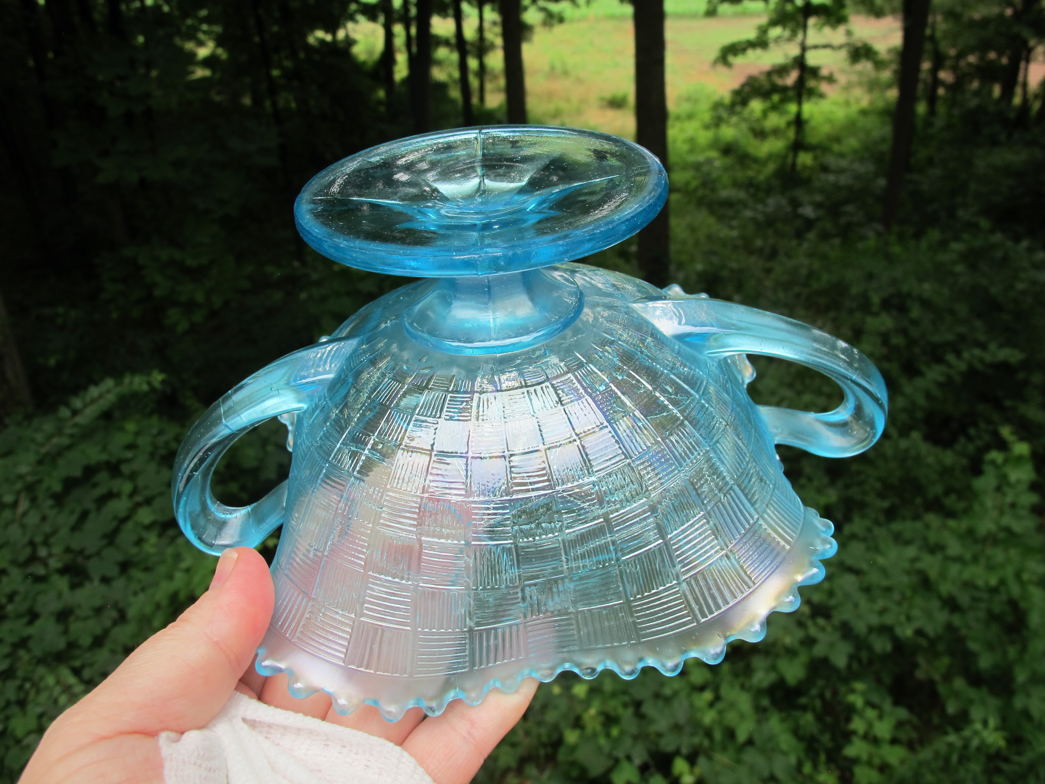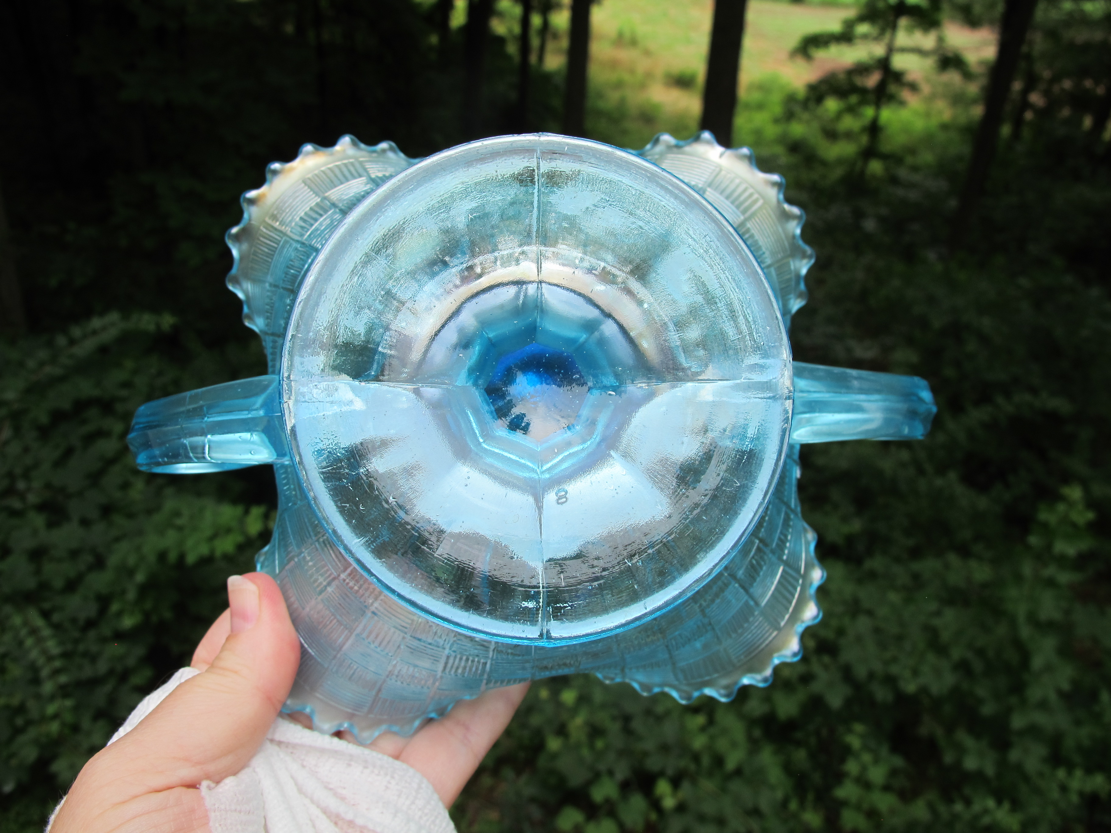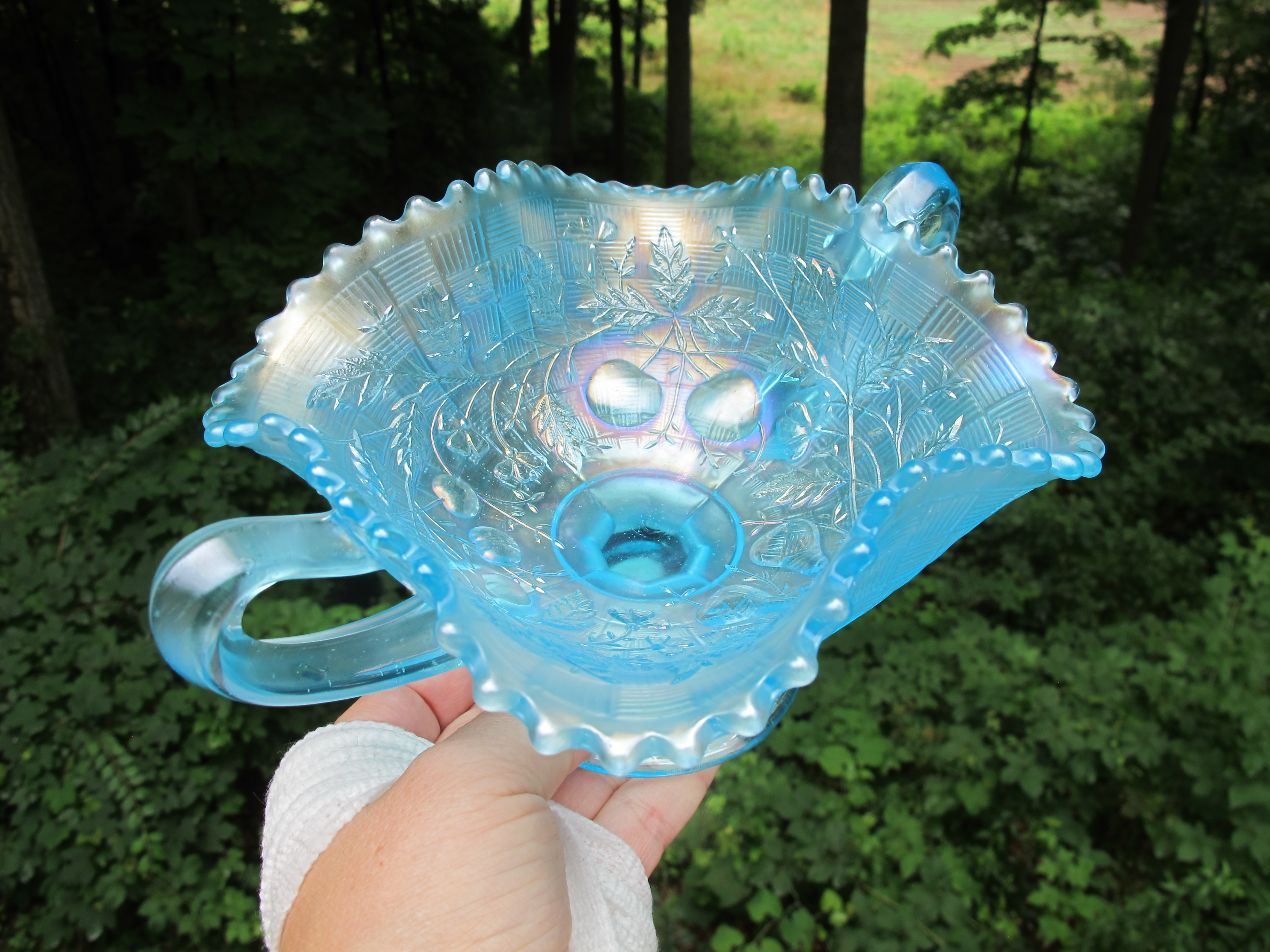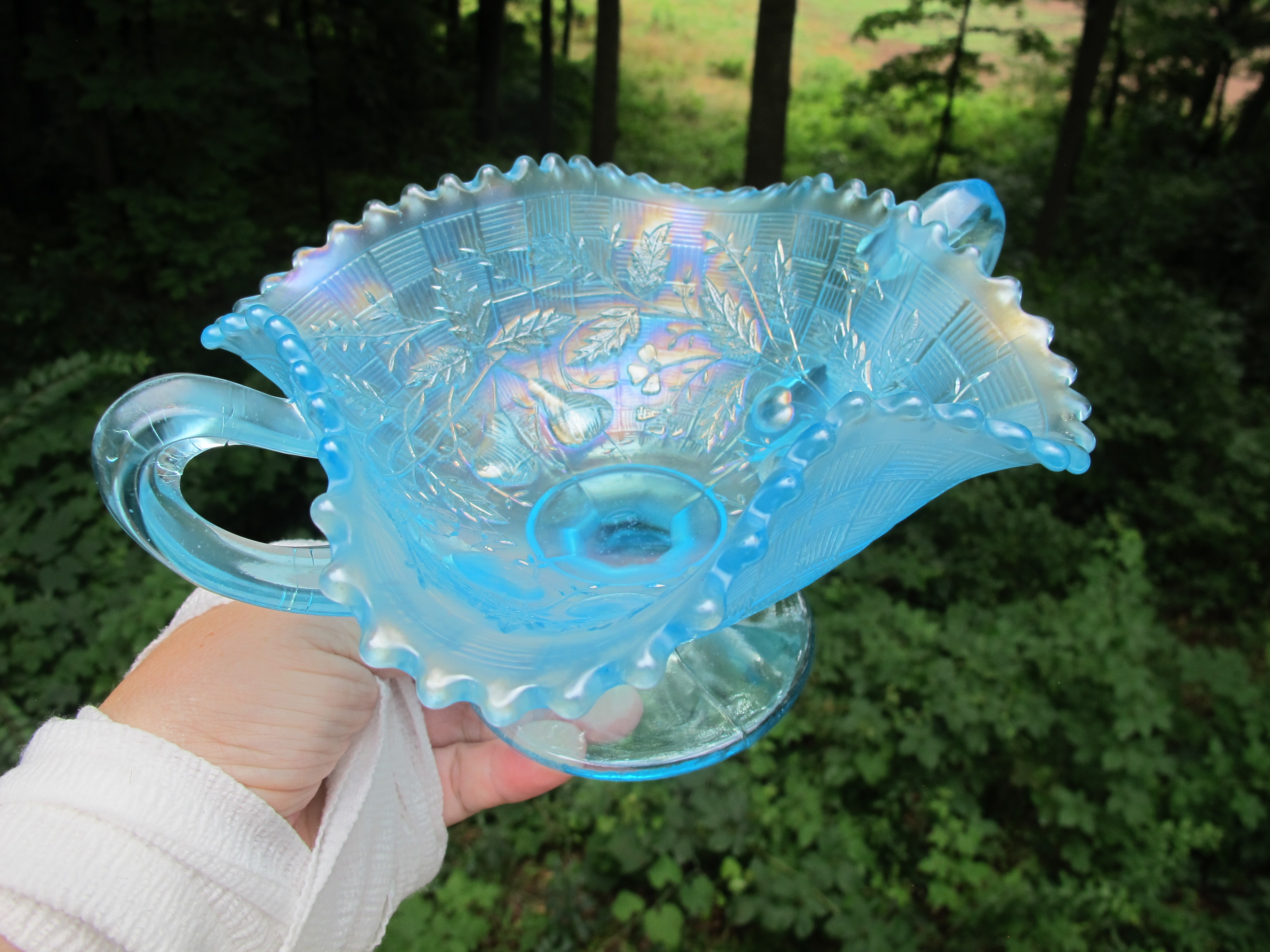 Here is a double-signed Northwood Ice Blue Fruits & Flowers bon bon! It is lovely antique carnival glass!