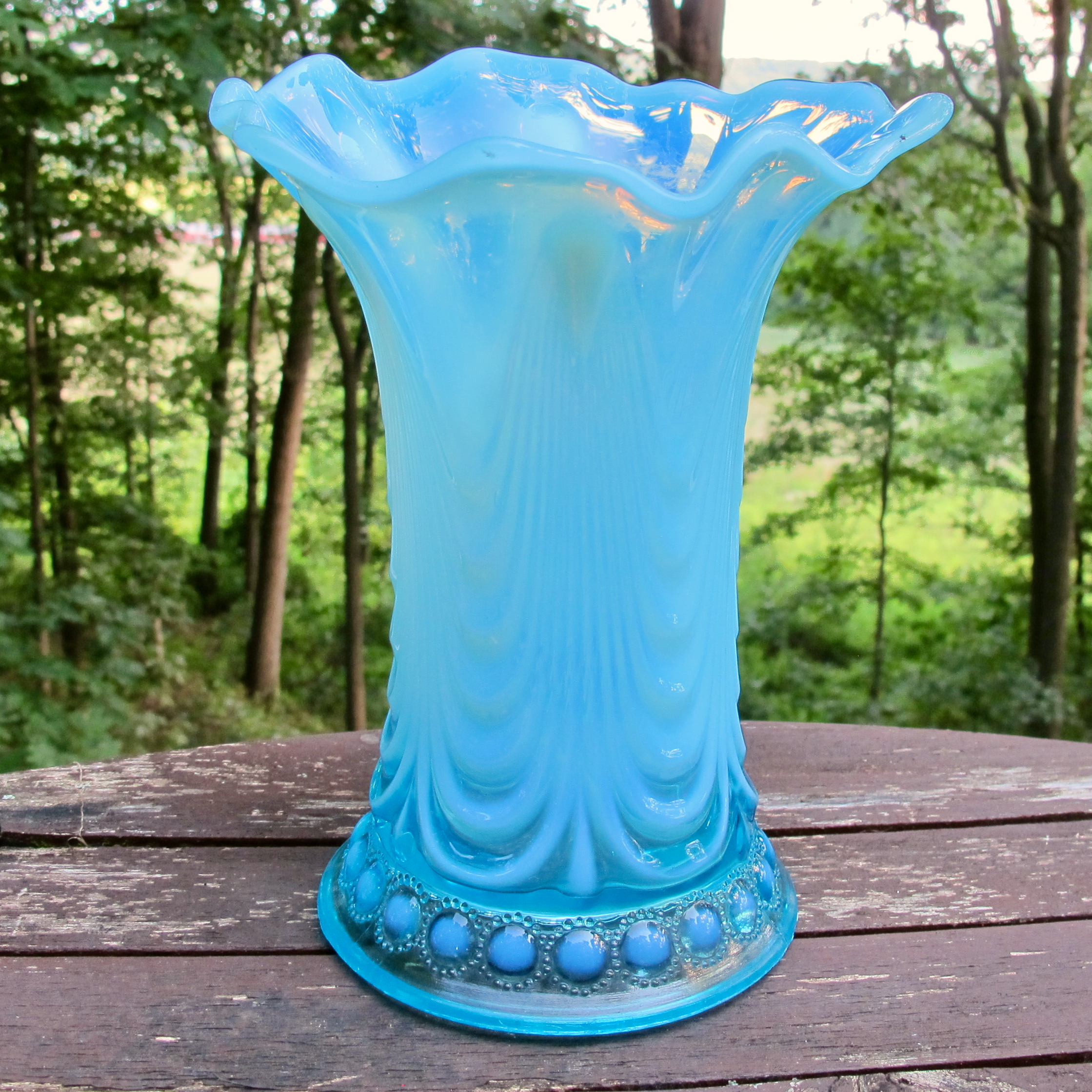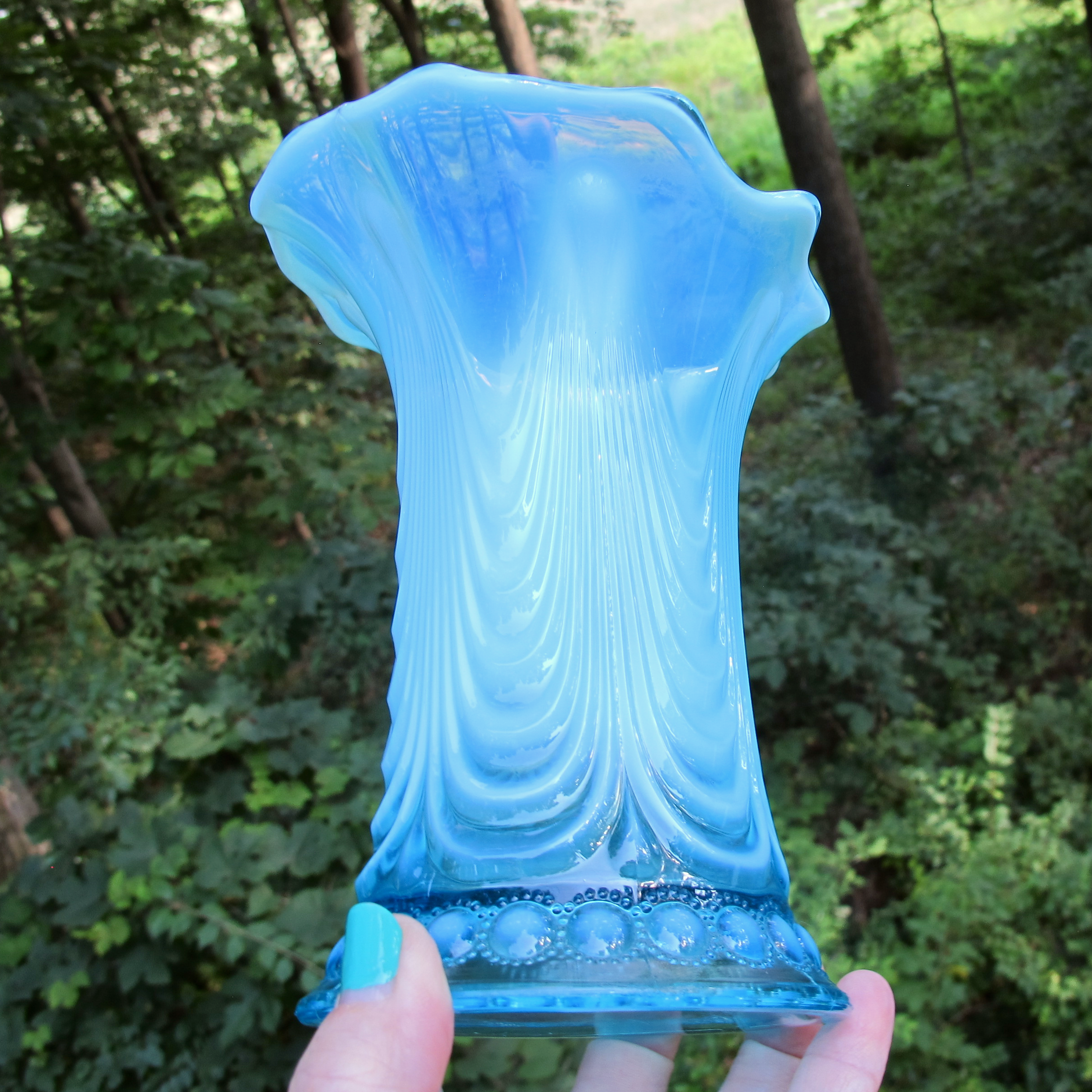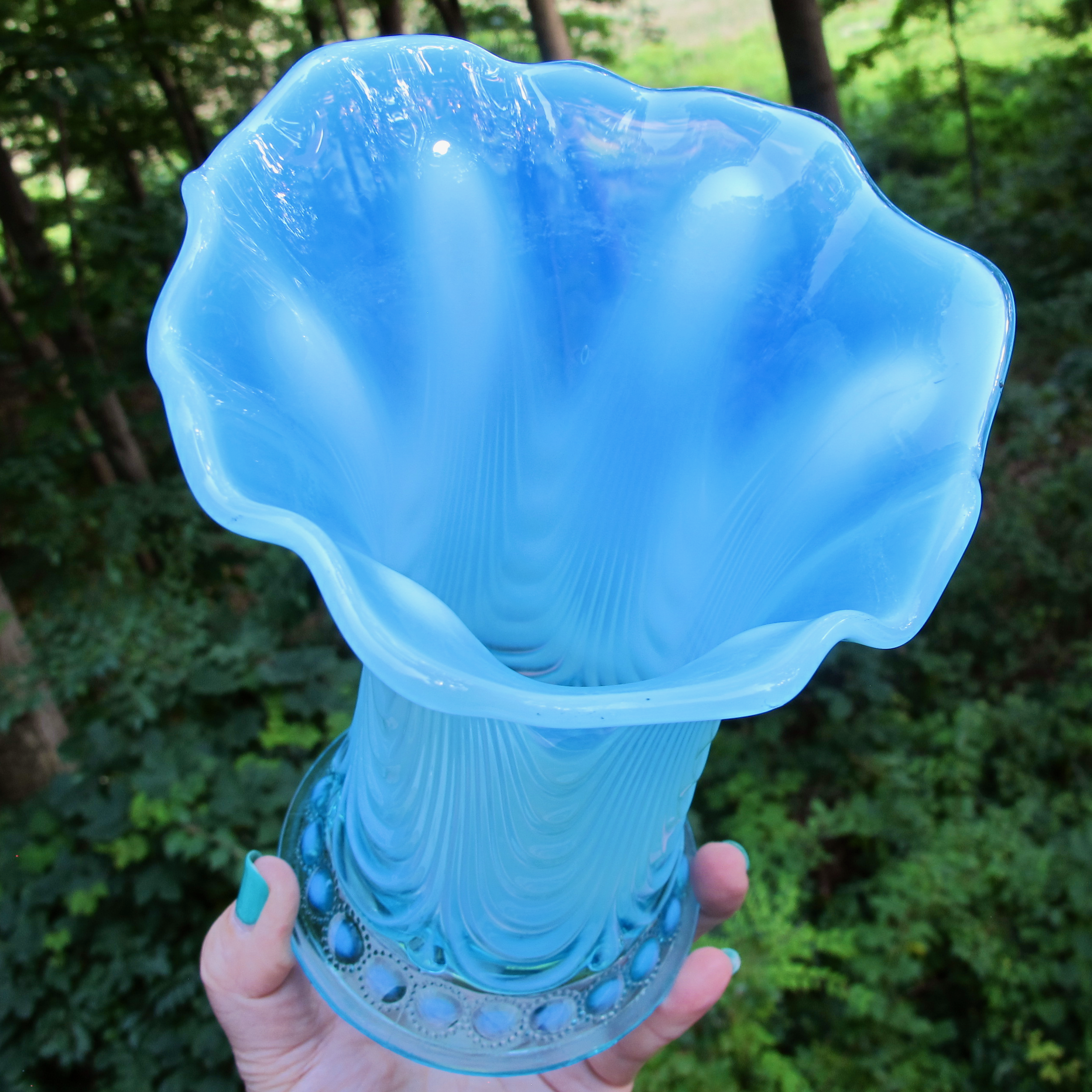 The Jewels around the base all have a dot of opalescence in them which I couldn’t get to show up well but you can’t miss it in person. Because this is a shorter vase, the drapes are very pronounced! The opal is so interesting on this one! AND THE MOUTH is HUGE!