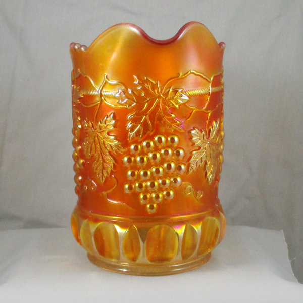 This is a Northwood GRAPE & CABLE THUMBPRINT Water Set with the Pitcher and Six (6) Tumblers in Marigold. These sit flat.