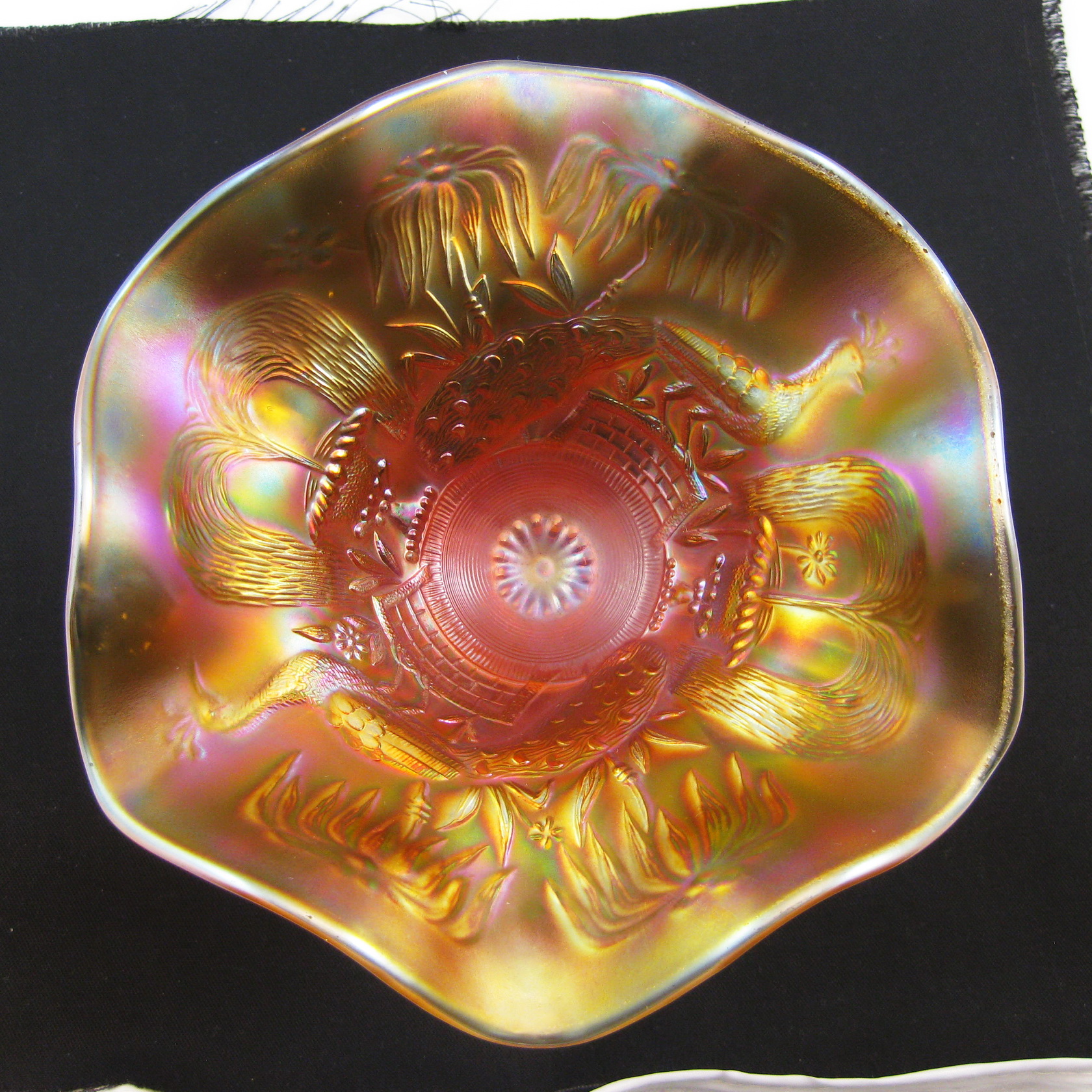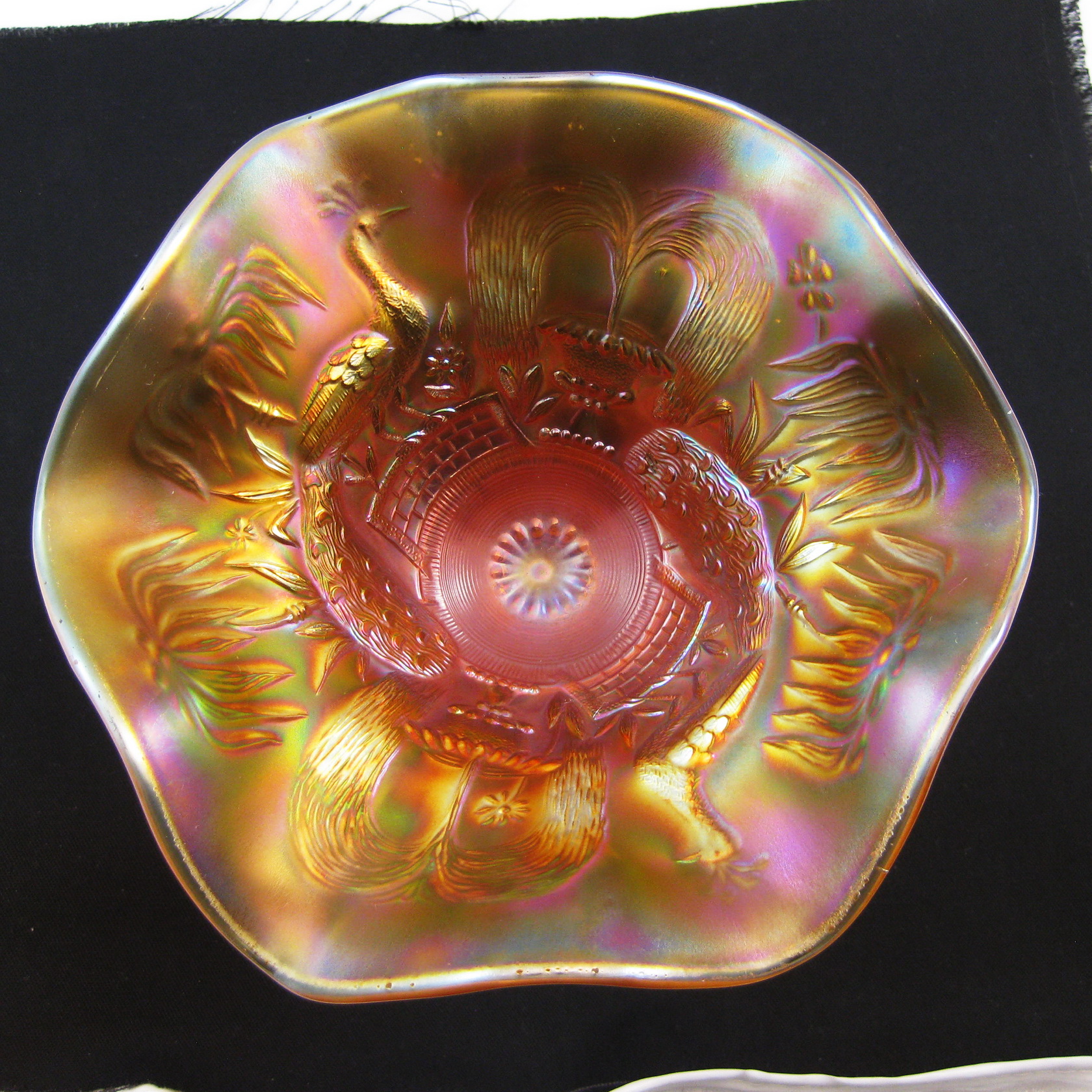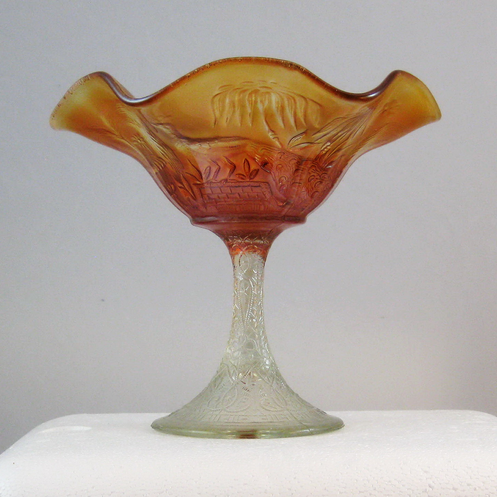 Antique Northwood Marigold Peacock at the Fountain Carnival Glass Compote