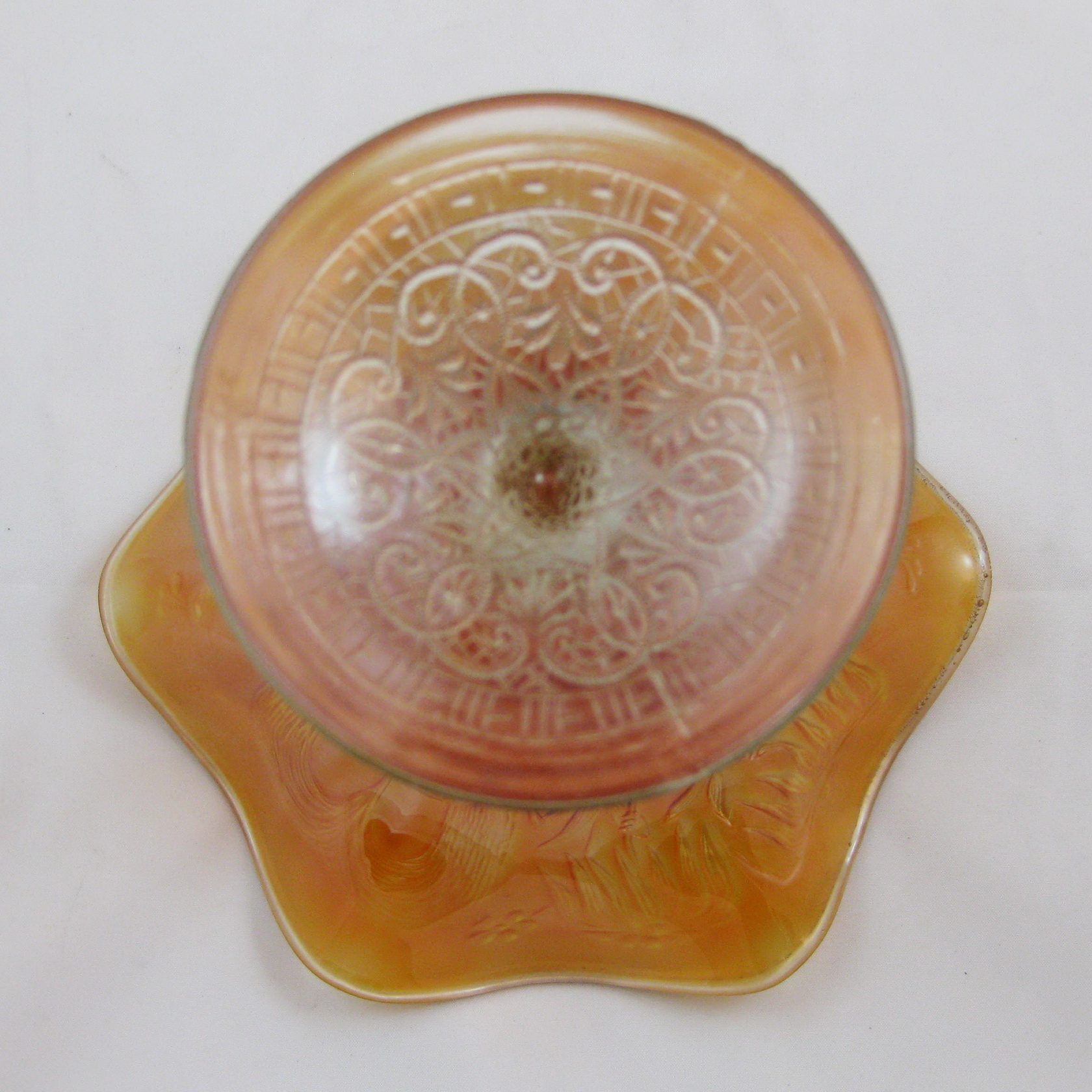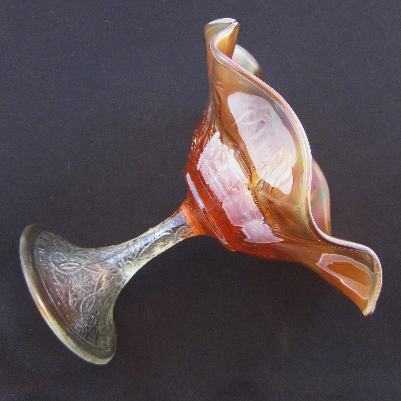 This is A Northwood PEACOCK AT THE FOUNTAIN 6-Ruffle Compote in a Dark Marigold.  This has a Plain back and a Clear patterned stem.  The Dark Marigold iridescence is easy to see and offers a striking contrast to the lighter Marigold color.