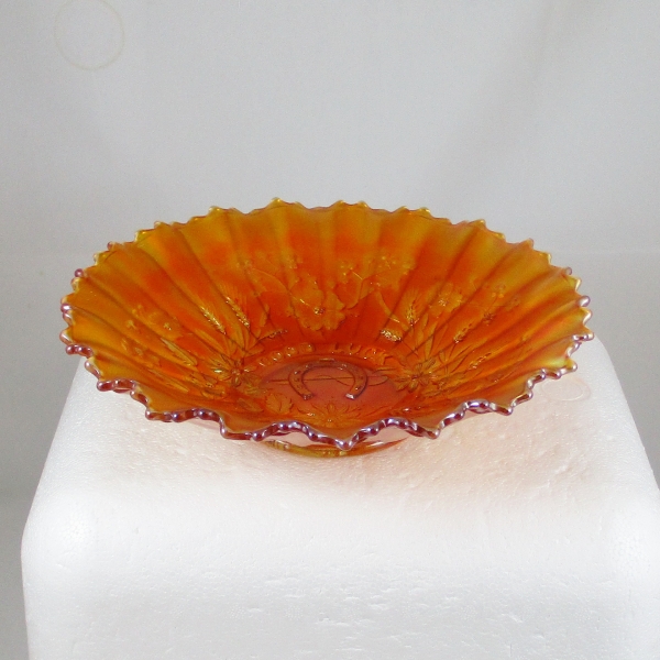 Pumpkin Marigold, a nice bright, darker Marigold. This is a bowl in the GOOD LUCK pattern with a RIB exterior. It is a popular pattern with collectors. And it has the highly desirable pie crust edge.