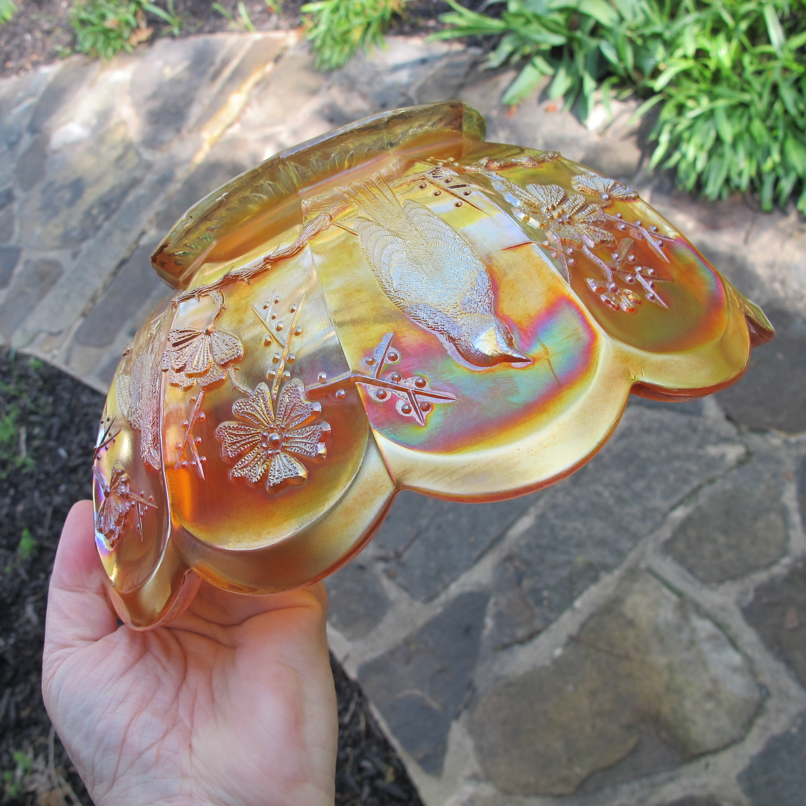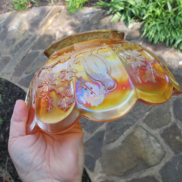 Antique Northwood Singing Birds Pumpkin Marigold Carnival Glass MASTER Berry Bowl