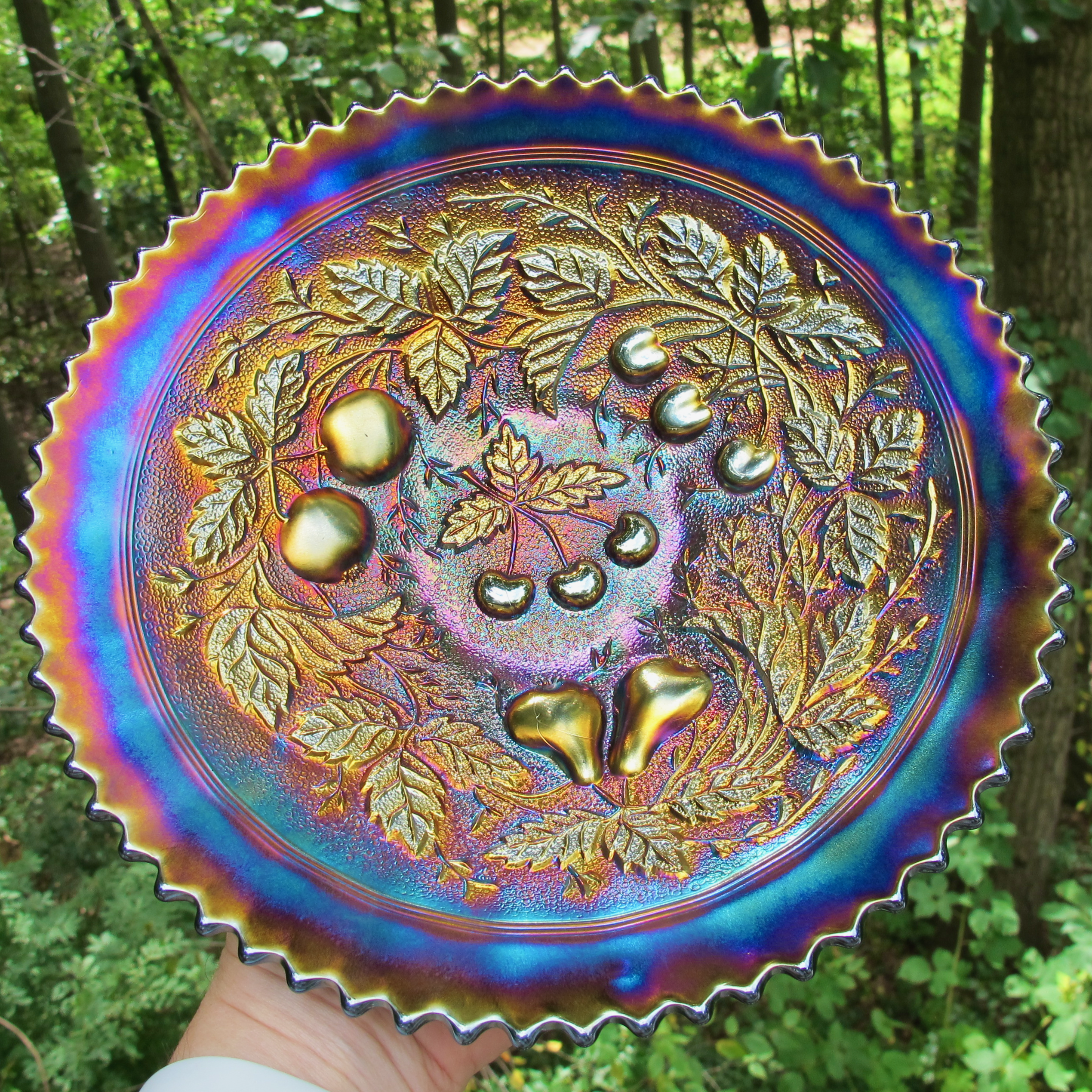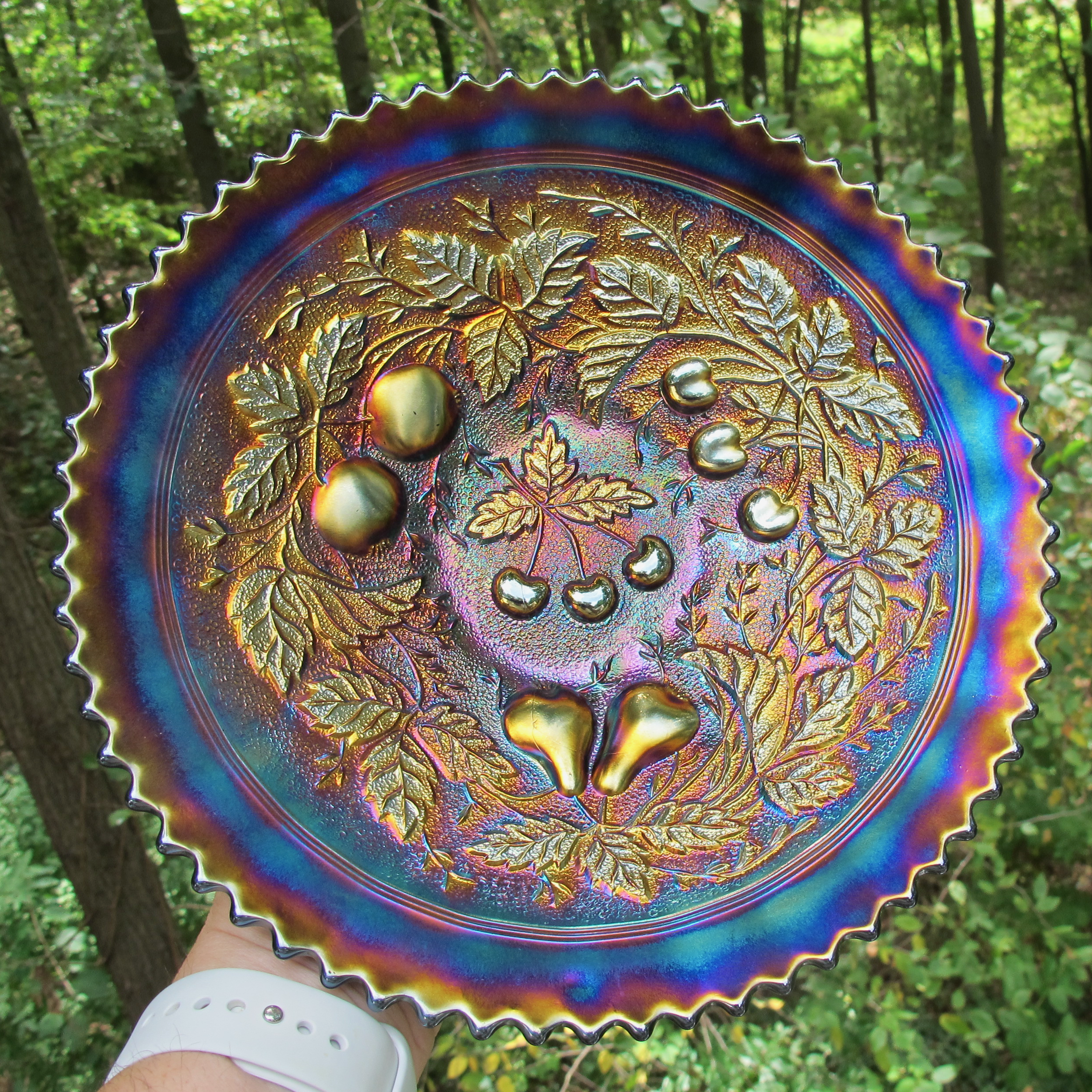 Antique Northwood Three Fruits Amethyst Carnival Glass Plate Stippled