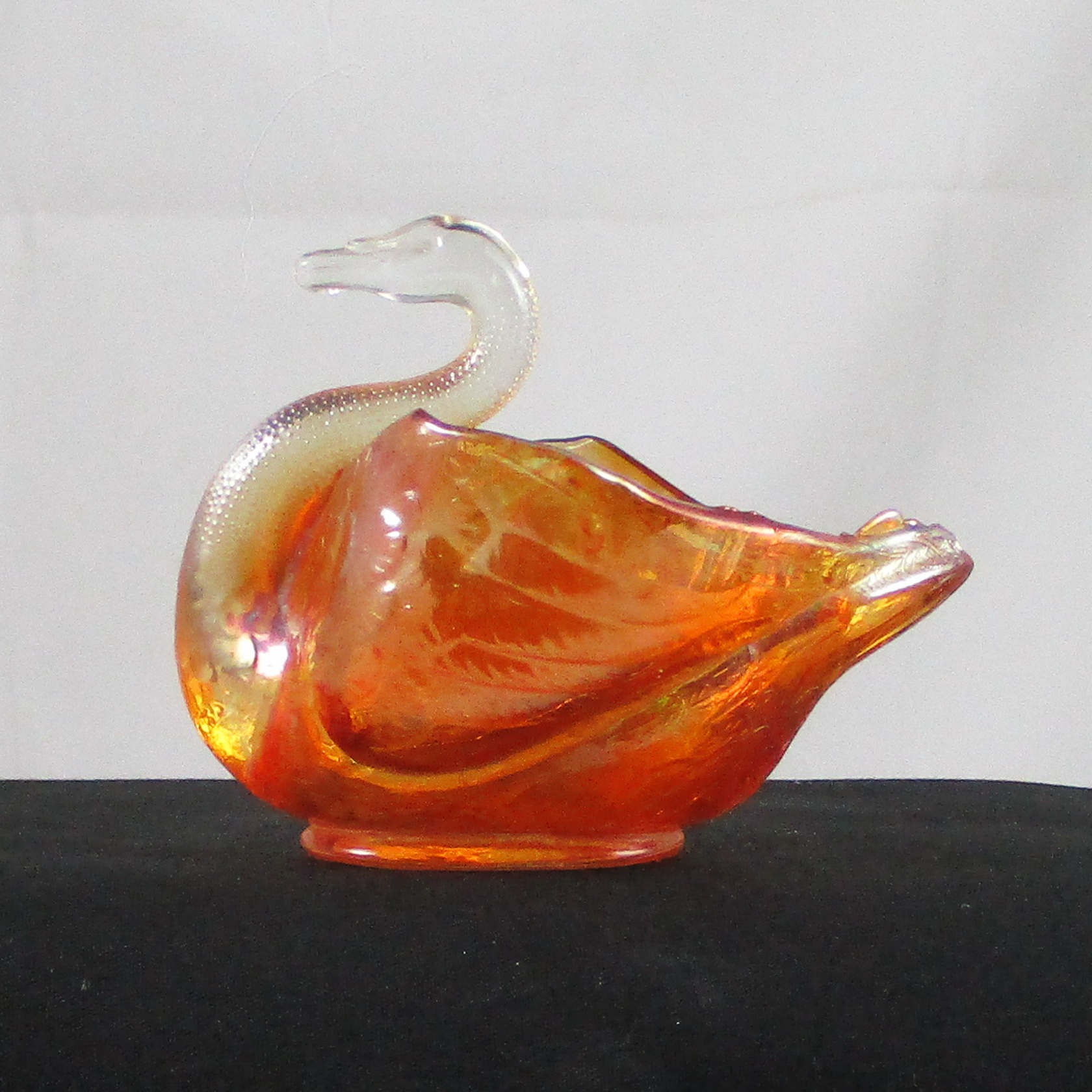 This is a DUGAN Marigold Carnival Glass Swan.