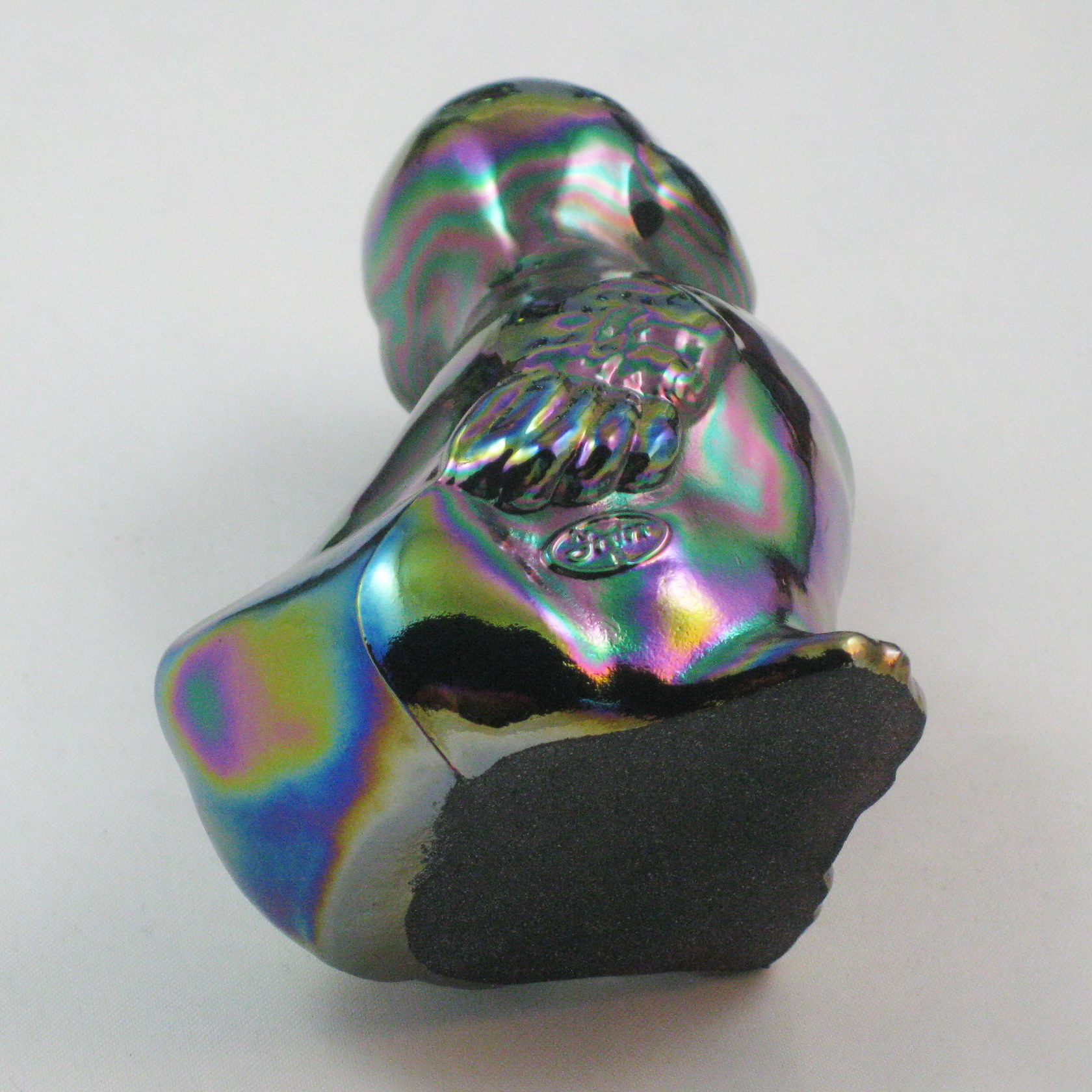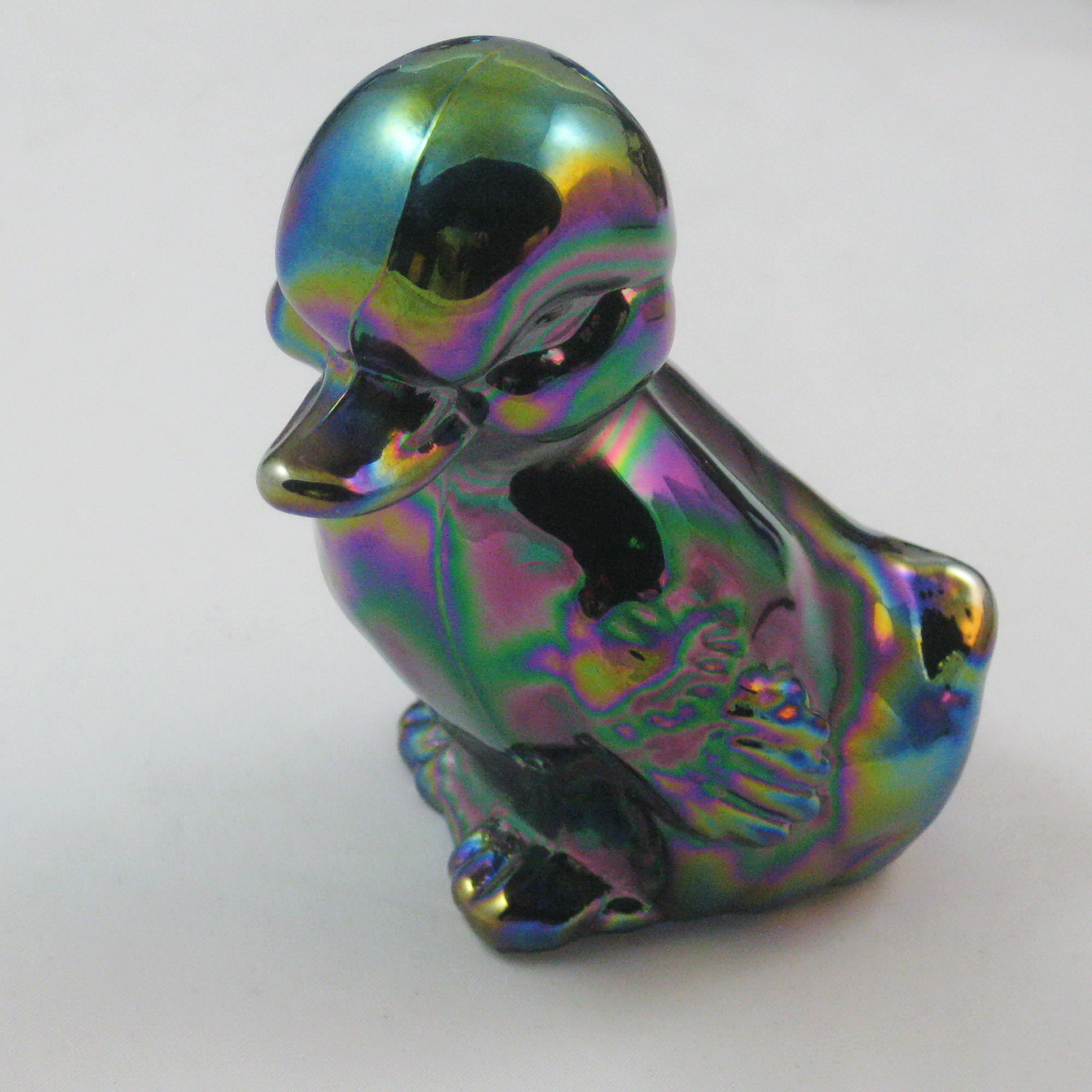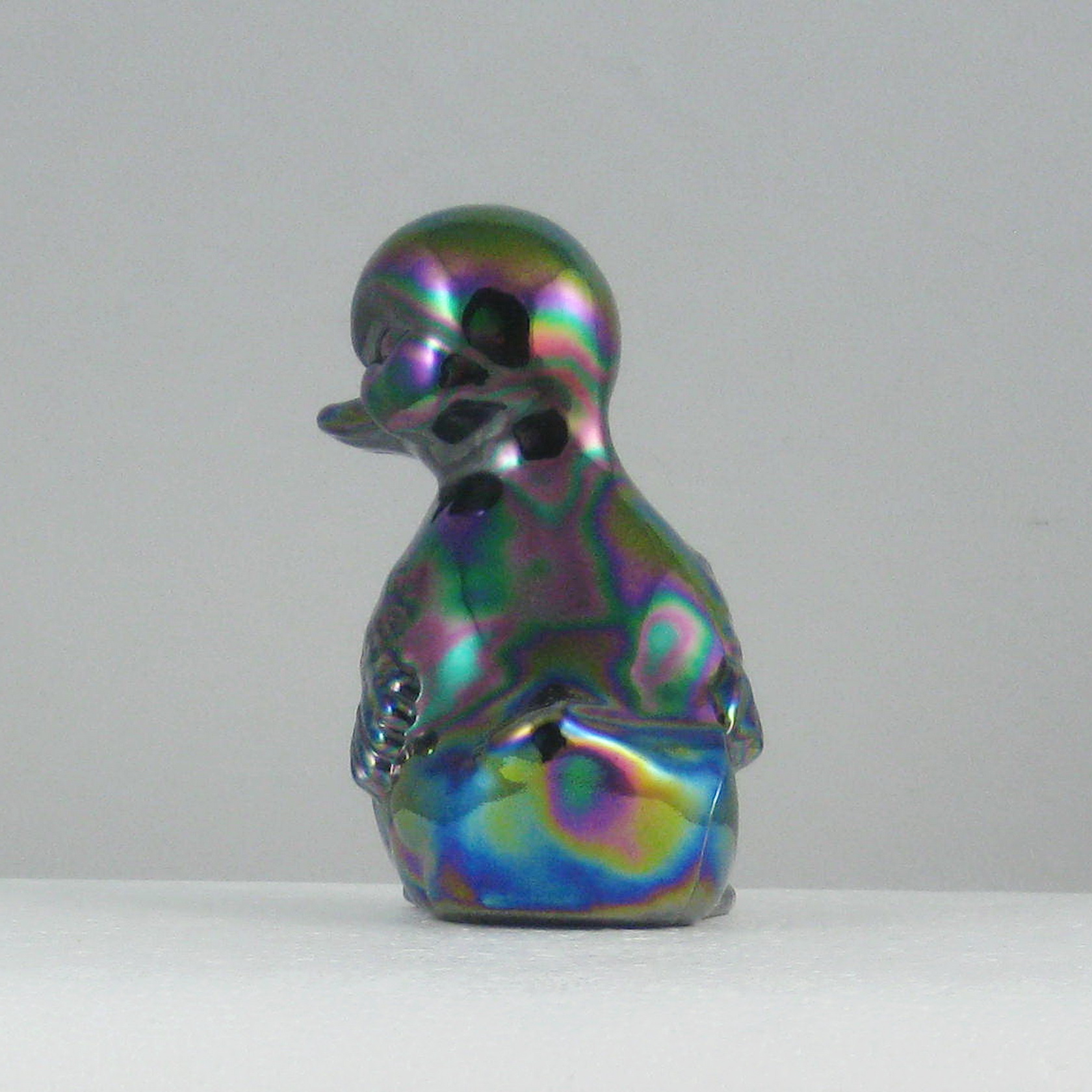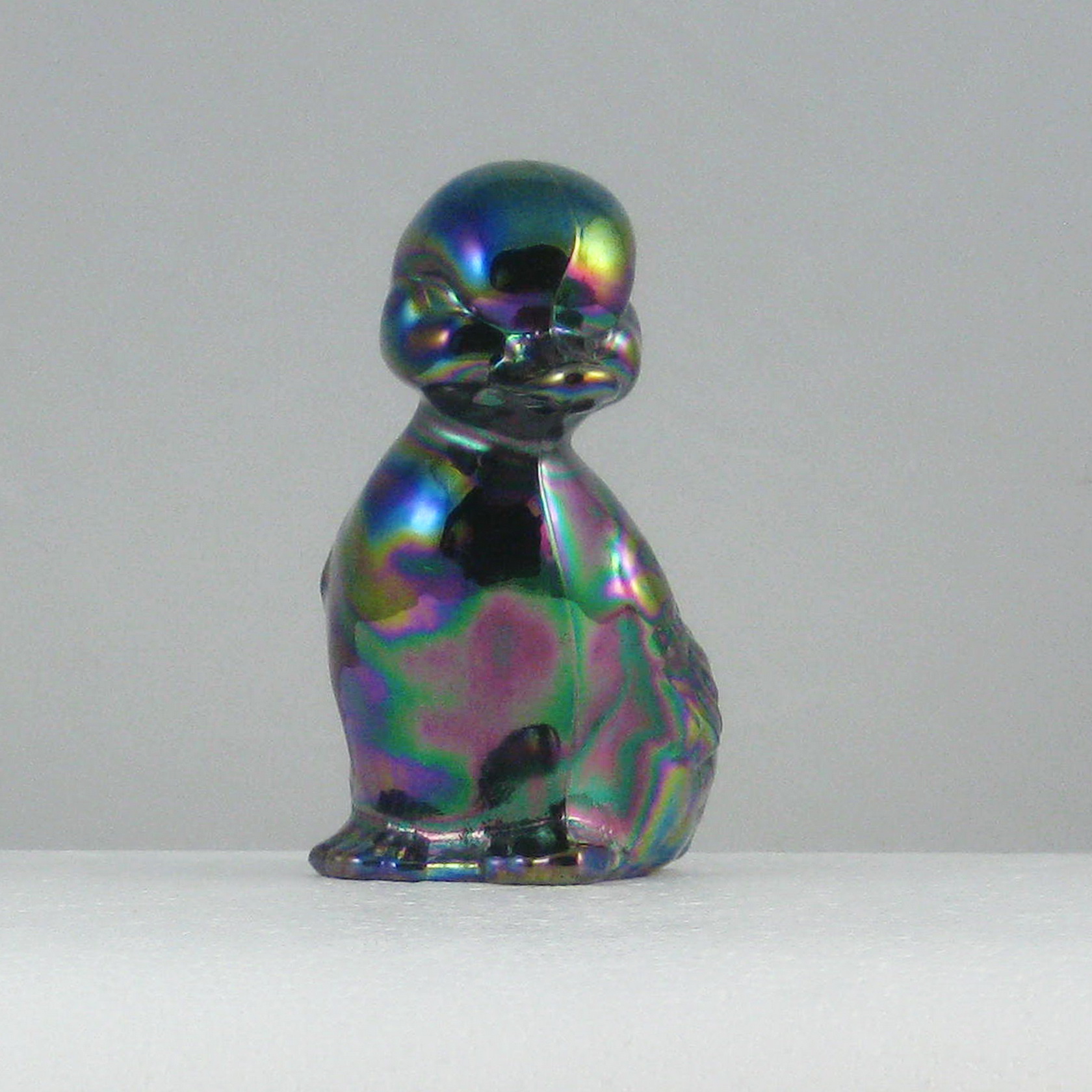 Fenton Duckling #5169 CN Amethyst Carnival Glass.  This is a small Duck shape and is nicely iridized, small, compact.  The base is factory ground to sit flat.