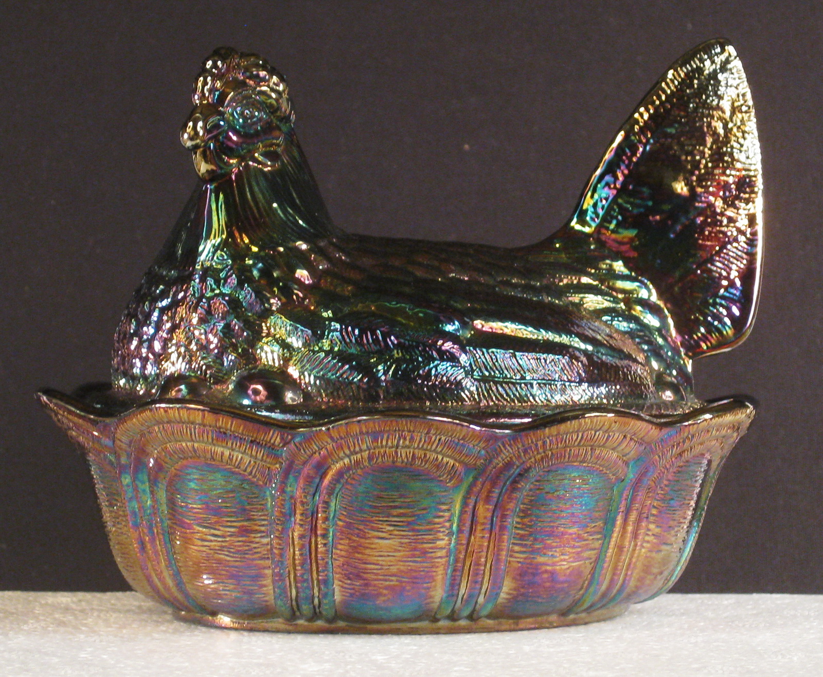 Small Size 5″ Hen On Nest Covered Candy Dish in Amethyst Carnival Glass.  The top is multi-color, a true oil on water look and the base is more of a Satin Iridescence.