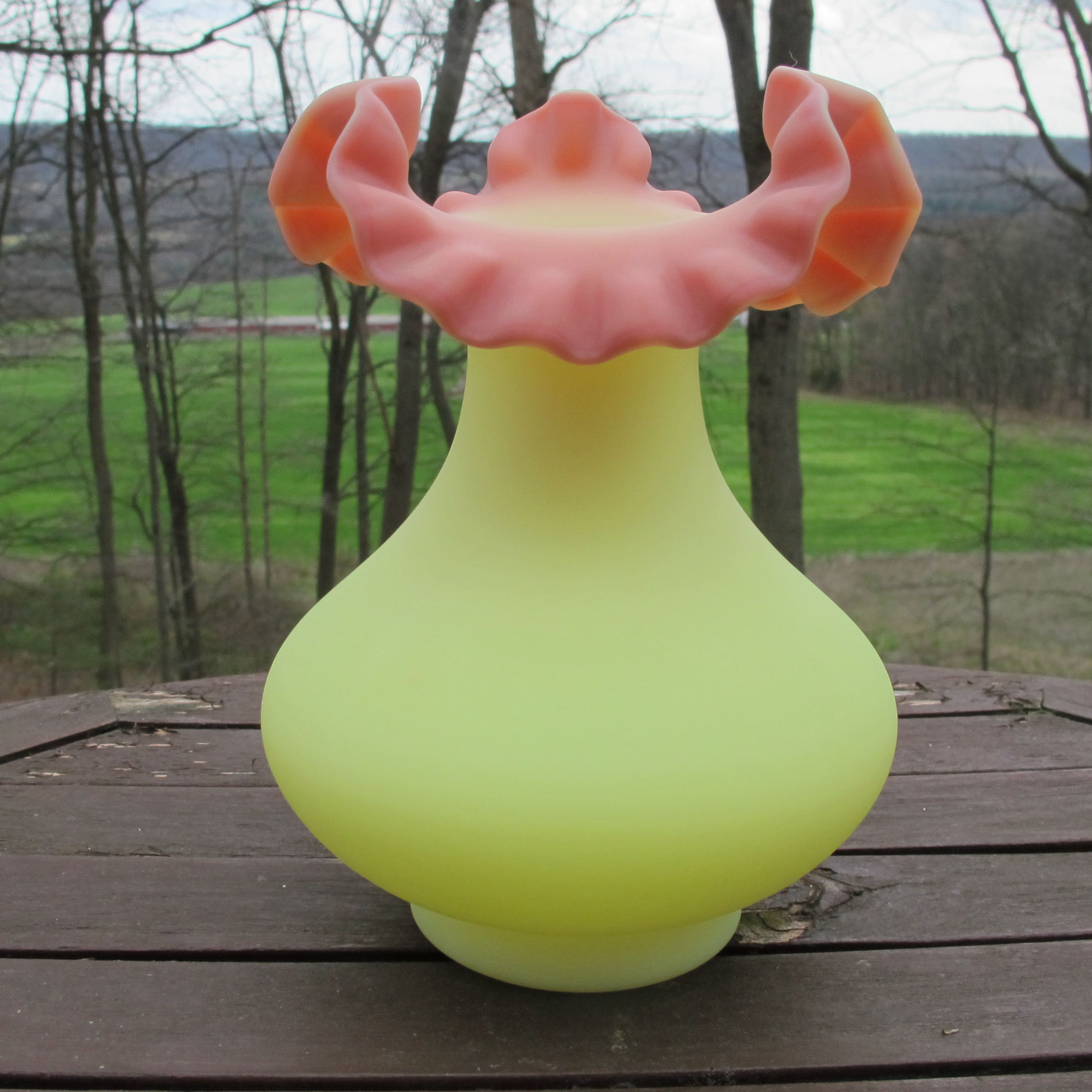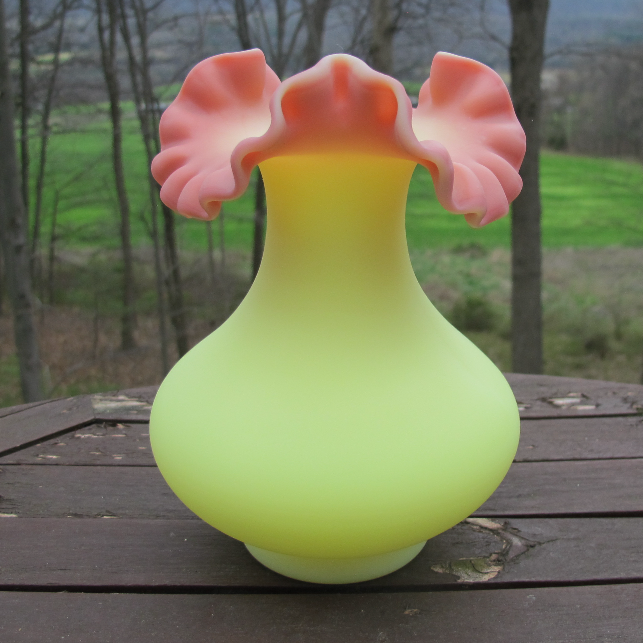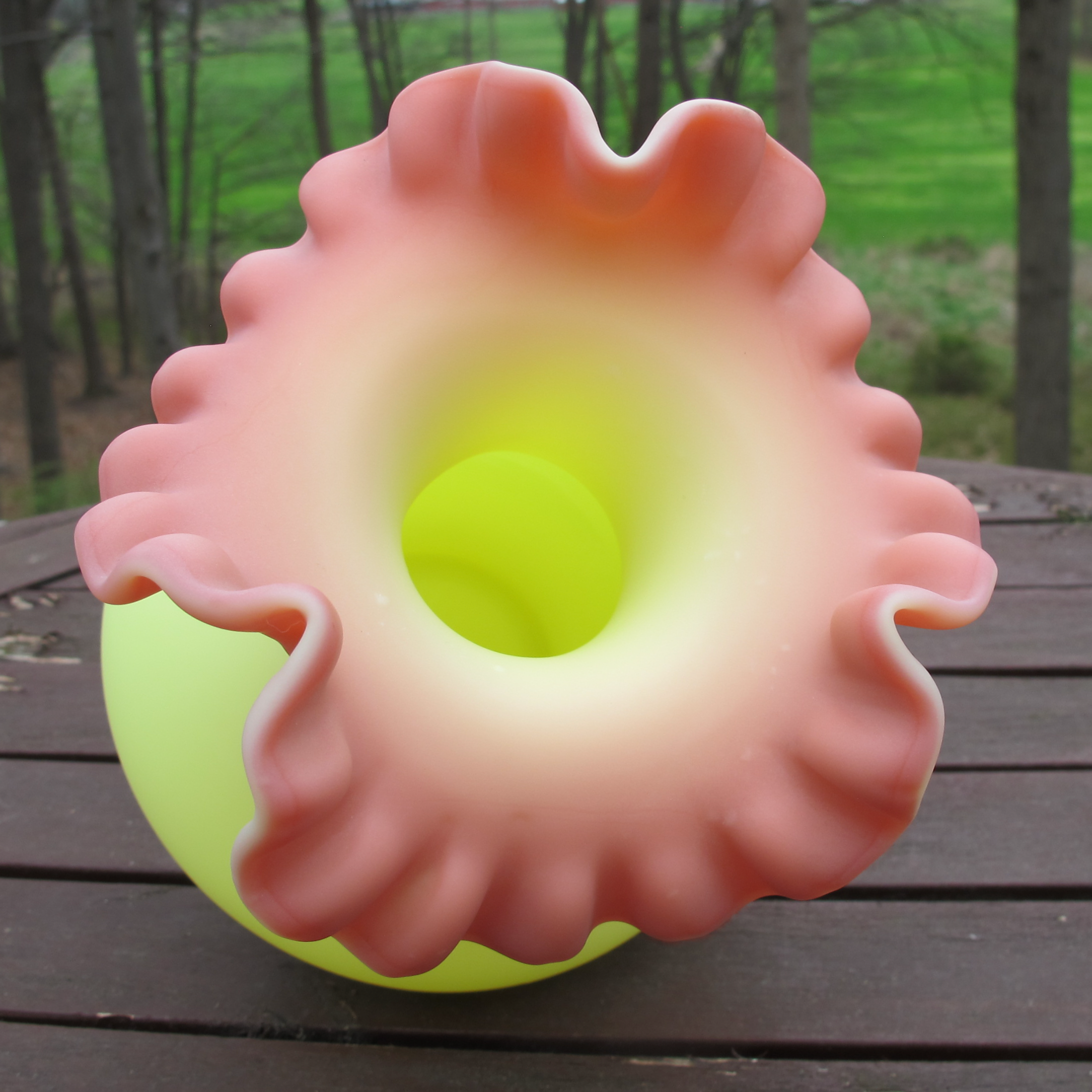 This is 1970s Fenton #BR 7252 Burmese glass! So beautiful with a rich, rosy pink crimped tri-corner top!