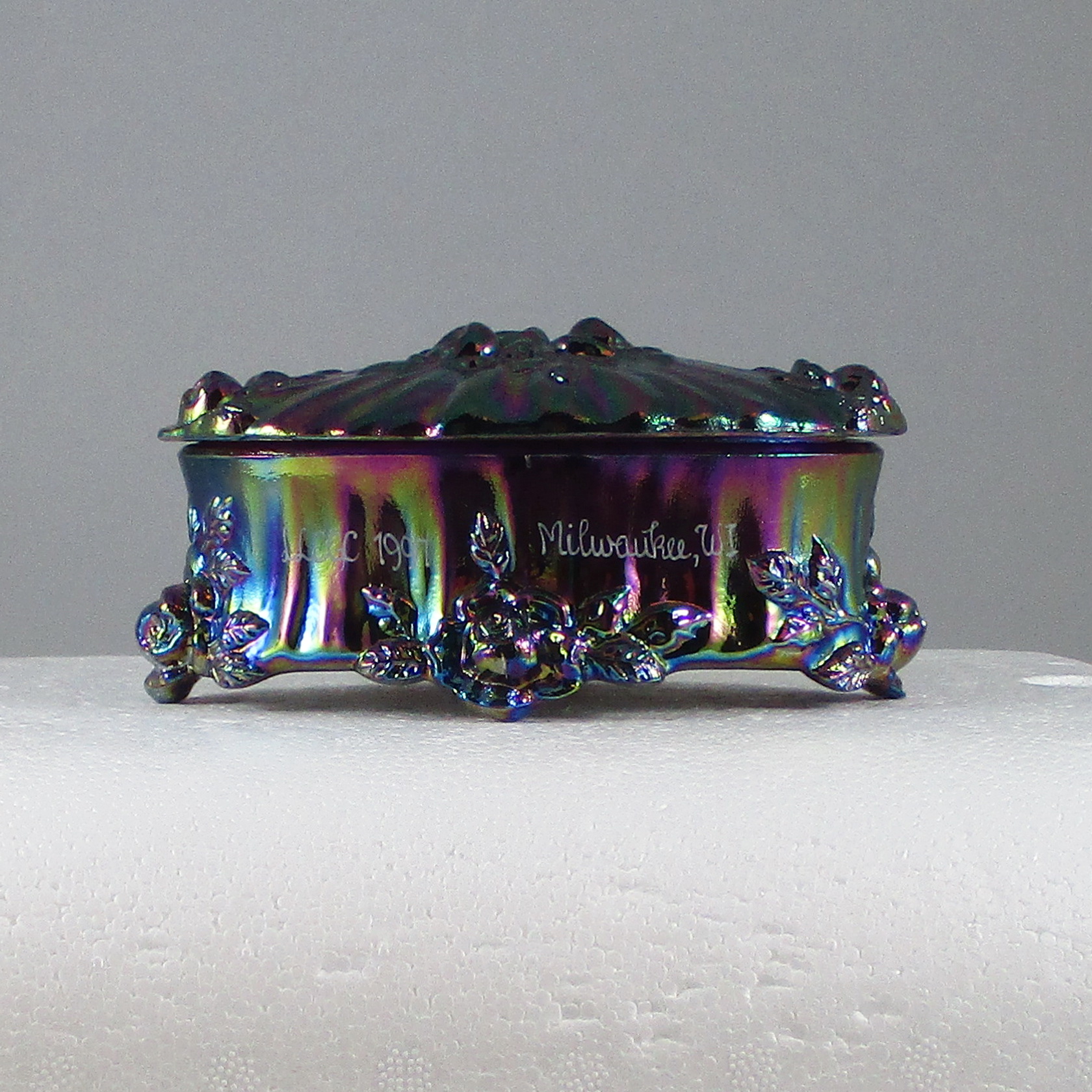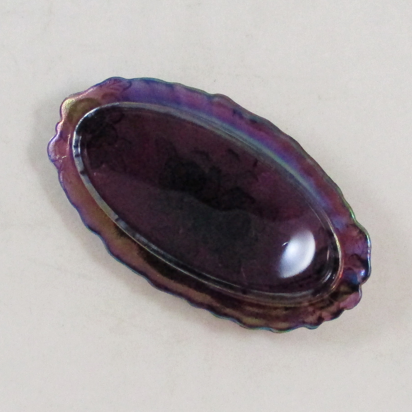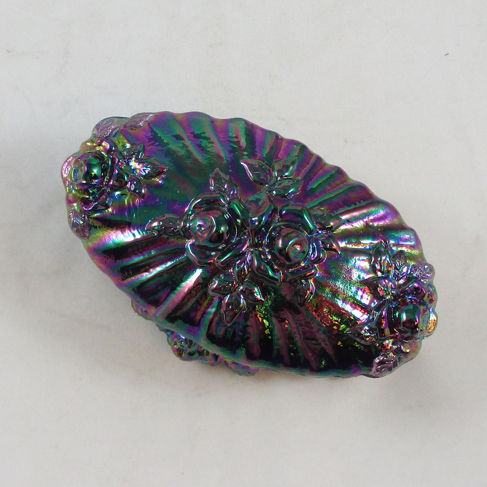 This is a beautiful item, the flowers are raised above the glass so they “POP”. This is a really nice small item that displays very well. This is Fenton’s ROSE #5793 PX; the PX is the color code for PLUM Carnival Glass. Most of us would call it Purple.