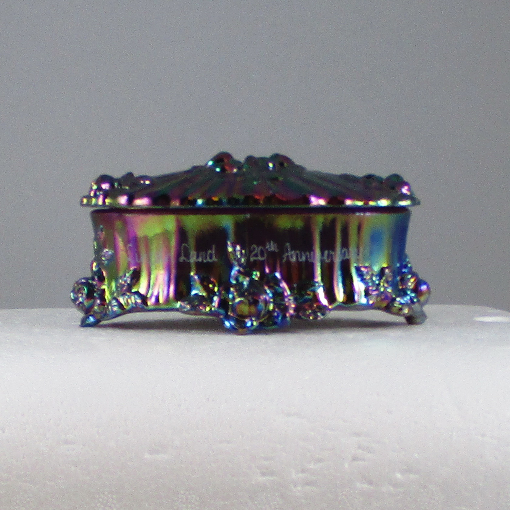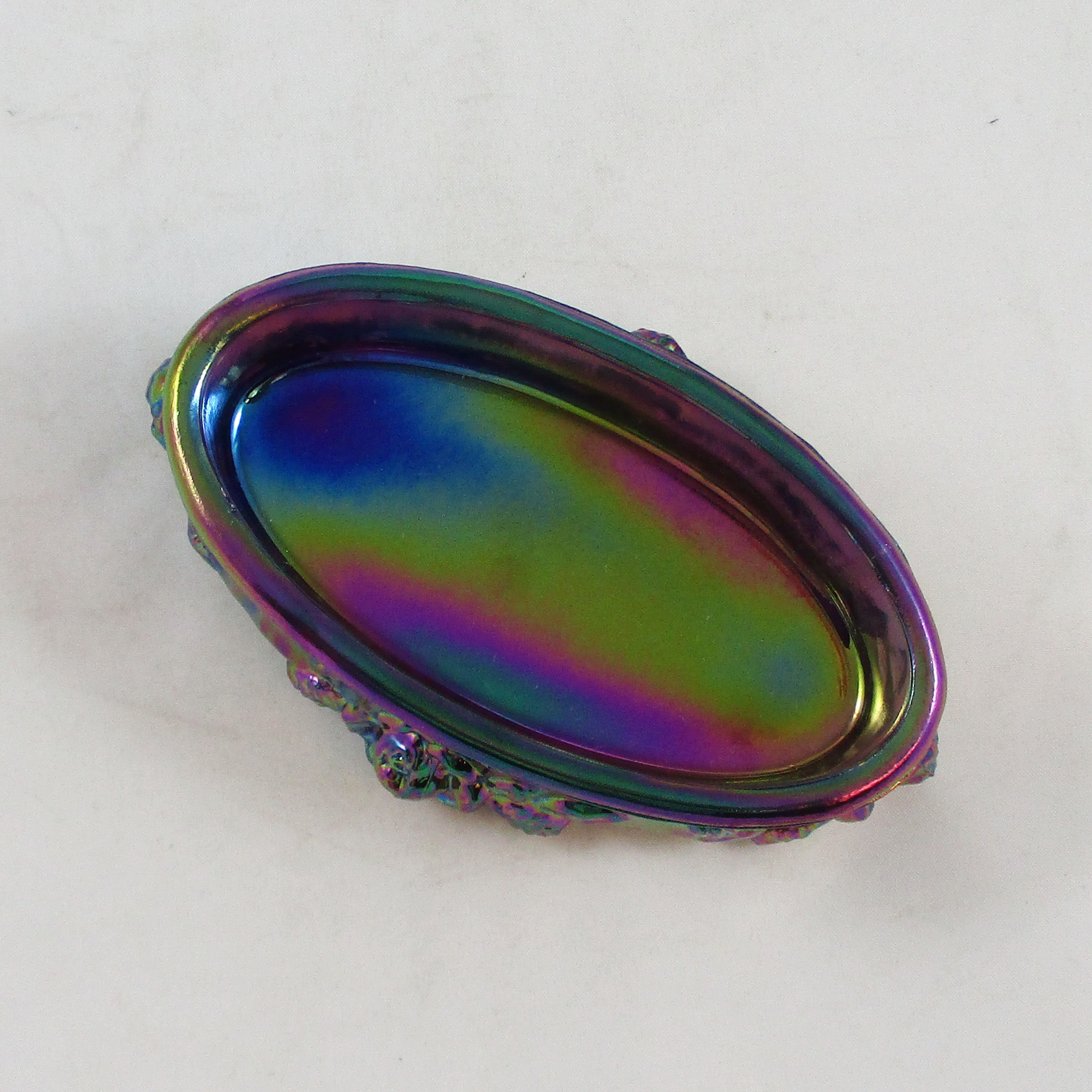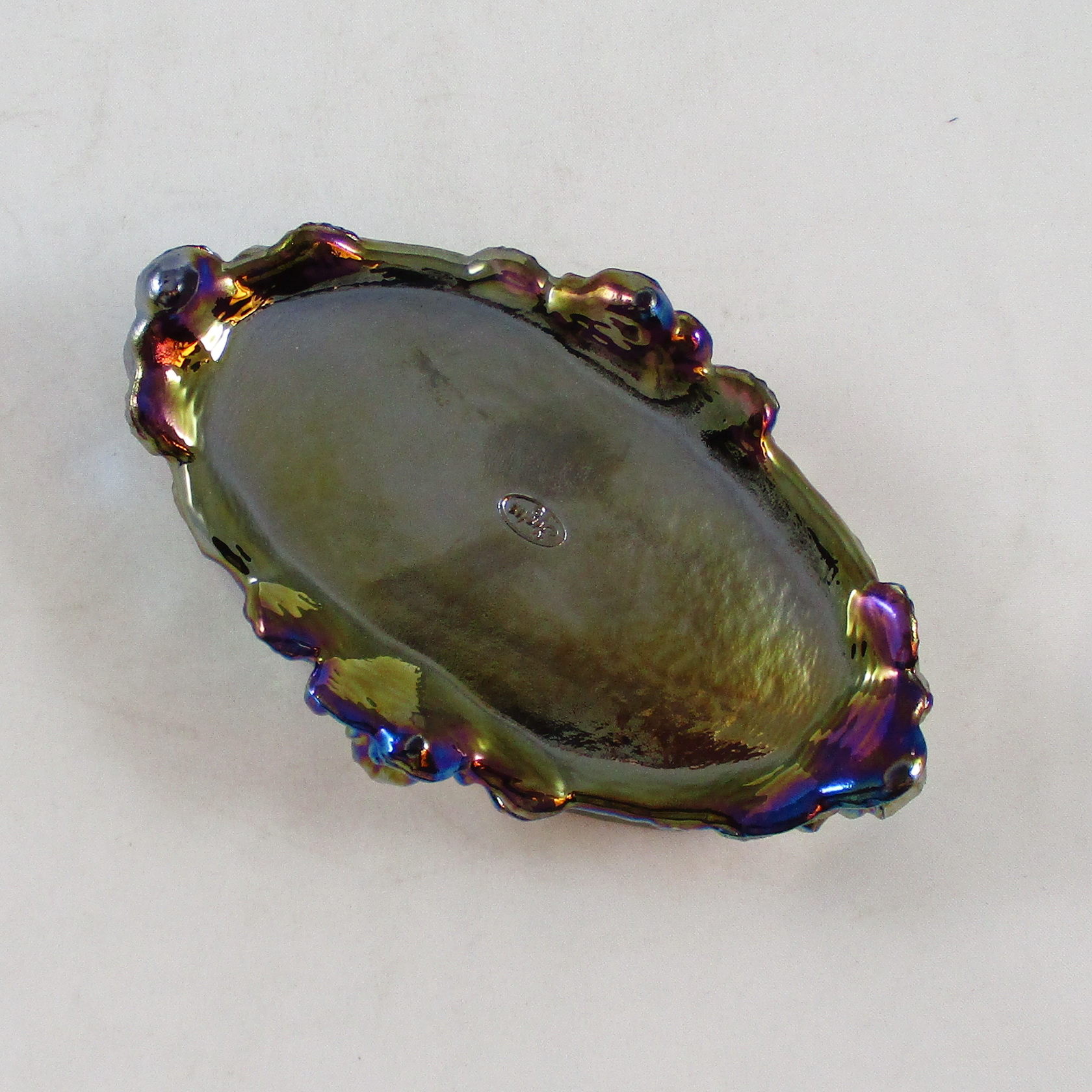 This is a beautiful item, the flowers are raised above the glass so they “POP”. This is a really nice small item that displays very well. This is Fenton’s ROSE #5793 PX; the PX is the color code for PLUM Carnival Glass. Most of us would call it Purple.