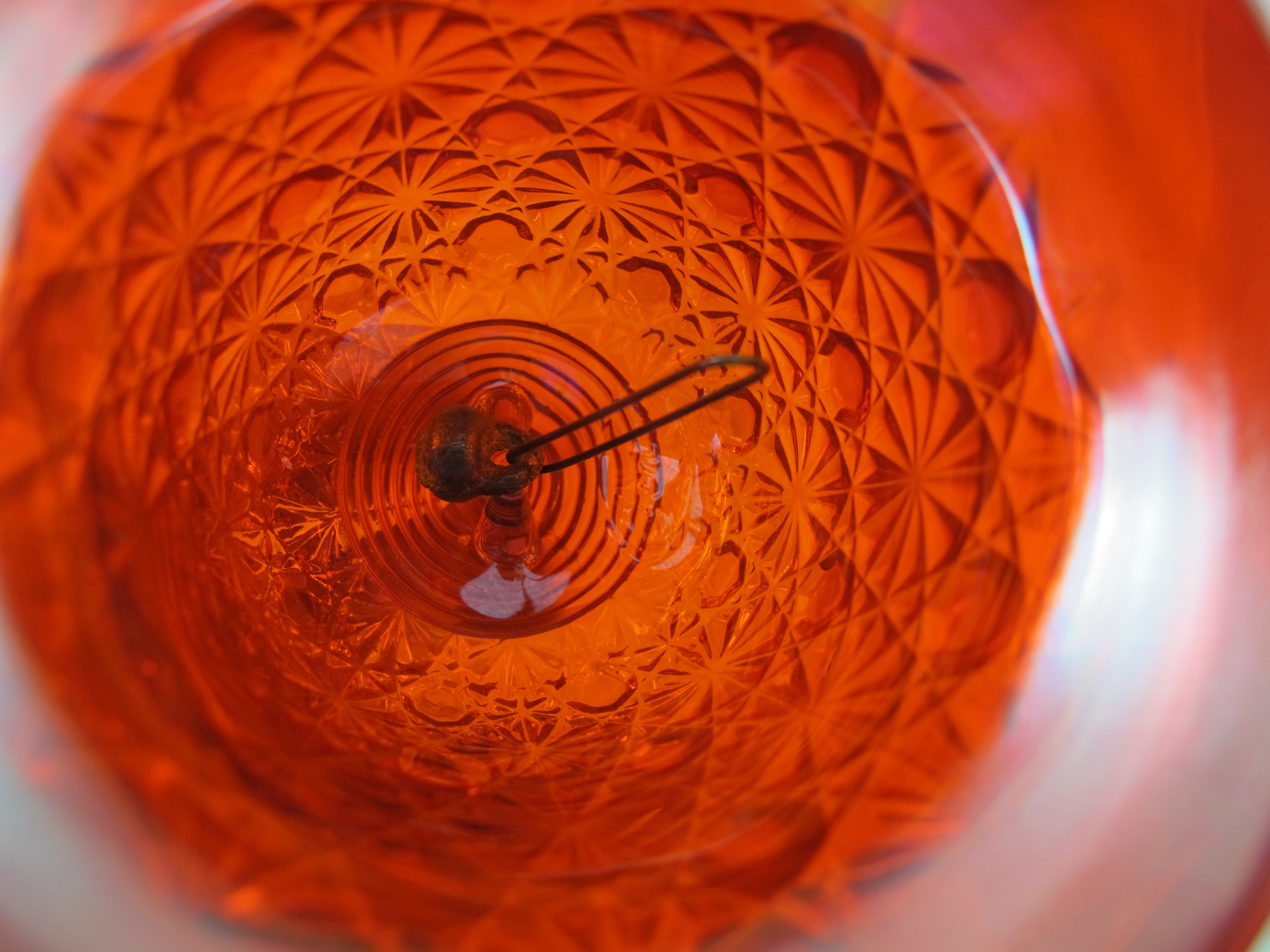 Here is a 1970s Fenton made carnival glass bell in the Daisy & Button pattern! The Fenton logo is the larger oval logo and it is on the interior.