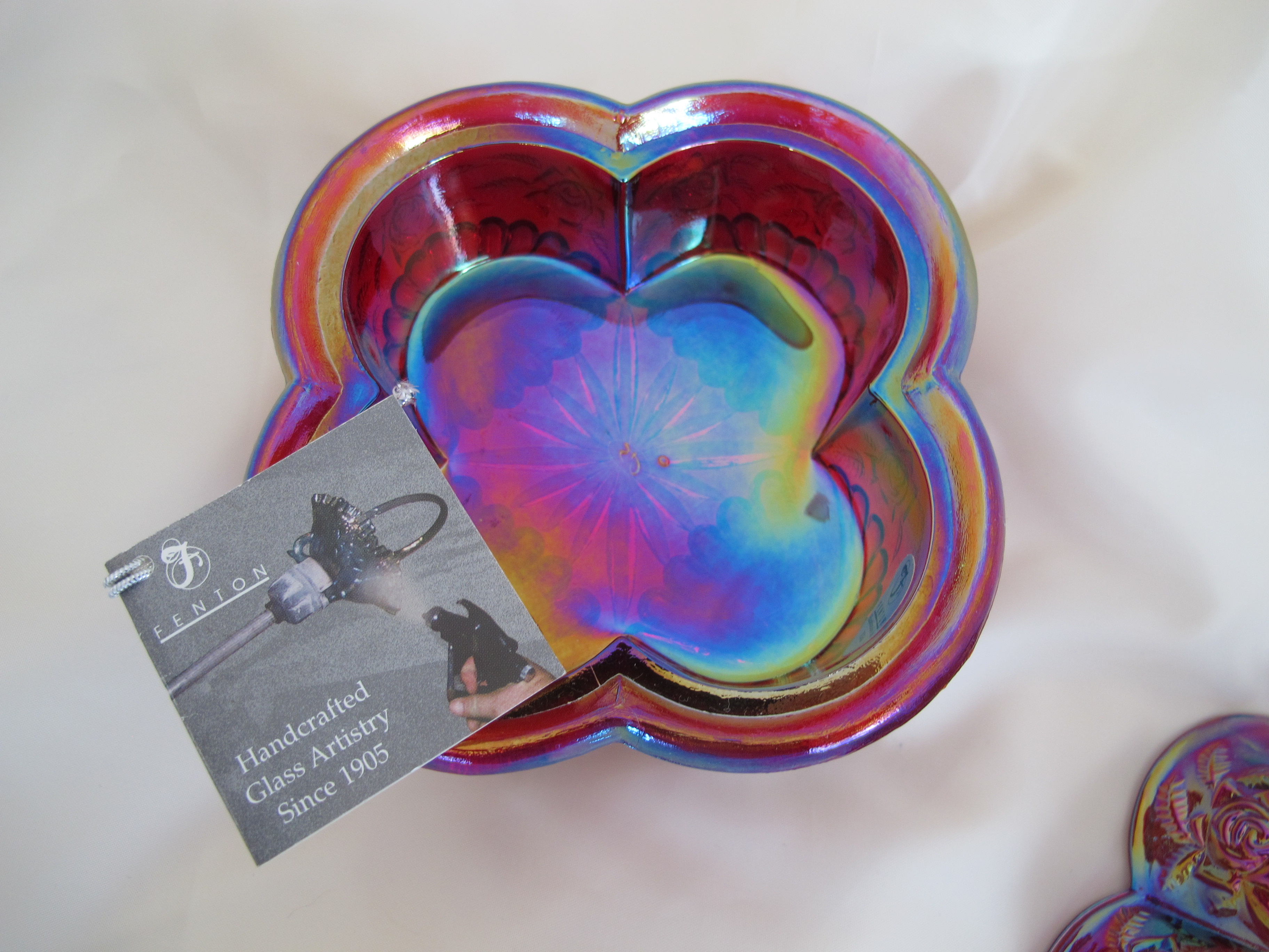 This is a lovely Fenton made (USA) trinket dish! As you can see the glass is CHERRY RED and beautifully iridized!  So much BLUe, PINK and YELLOW!
