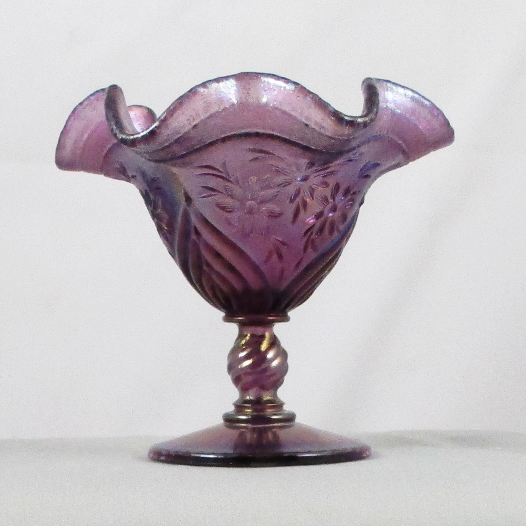 Here is a SUPER nice Wisteria colored pattern glass piece by Fenton. I have not found this color in the Fenton Catalogs yet; however, in the 1995 catalog, this 6-ruffle Compote is called a Nut Dish. There is a small 1/2 inch band at the top on the exterior that is Stretch Glass. And, 3/4 inch on the inside of the top rim too. The interior is Plain. I do not know the common name of the exterior. The small Swirl pattern knob on the stem is a nice touch. All in all, this is a really nice item.