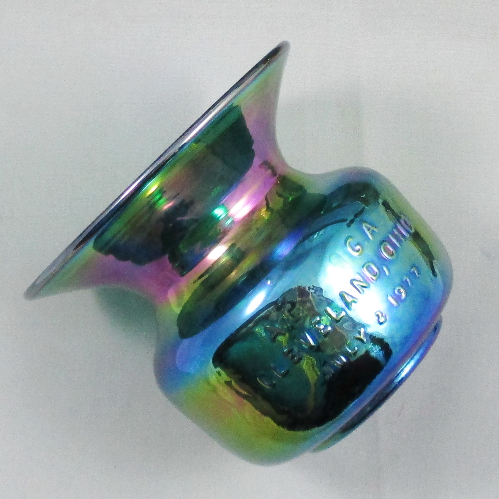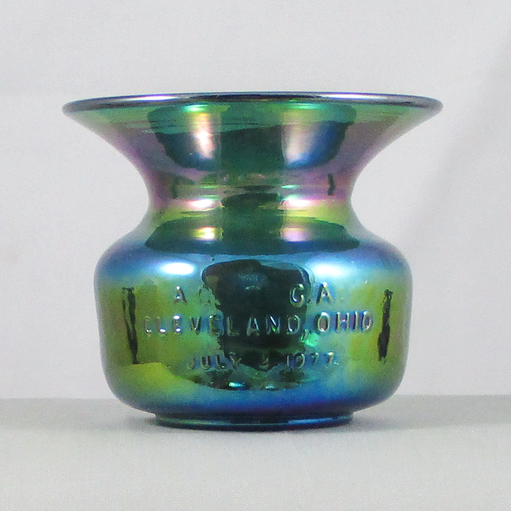 This Spittoon shape was made by Charles GIBSON for the American Carnival Glass Association Convention in Cleveland, OH in 1977. As with all Carnival Glass Club Souvenirs, the runs were very limited. This item had approximately 300 pieces.