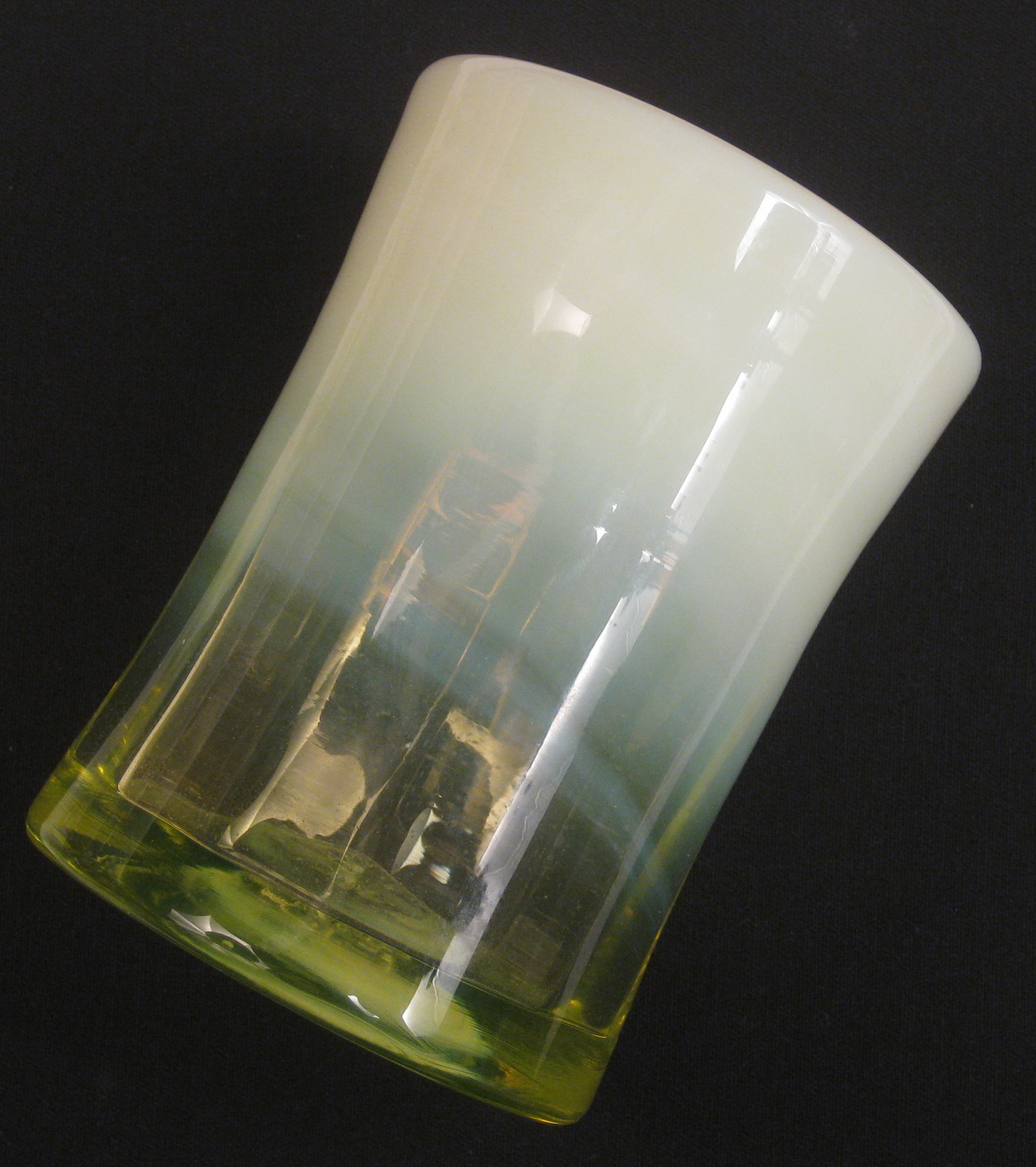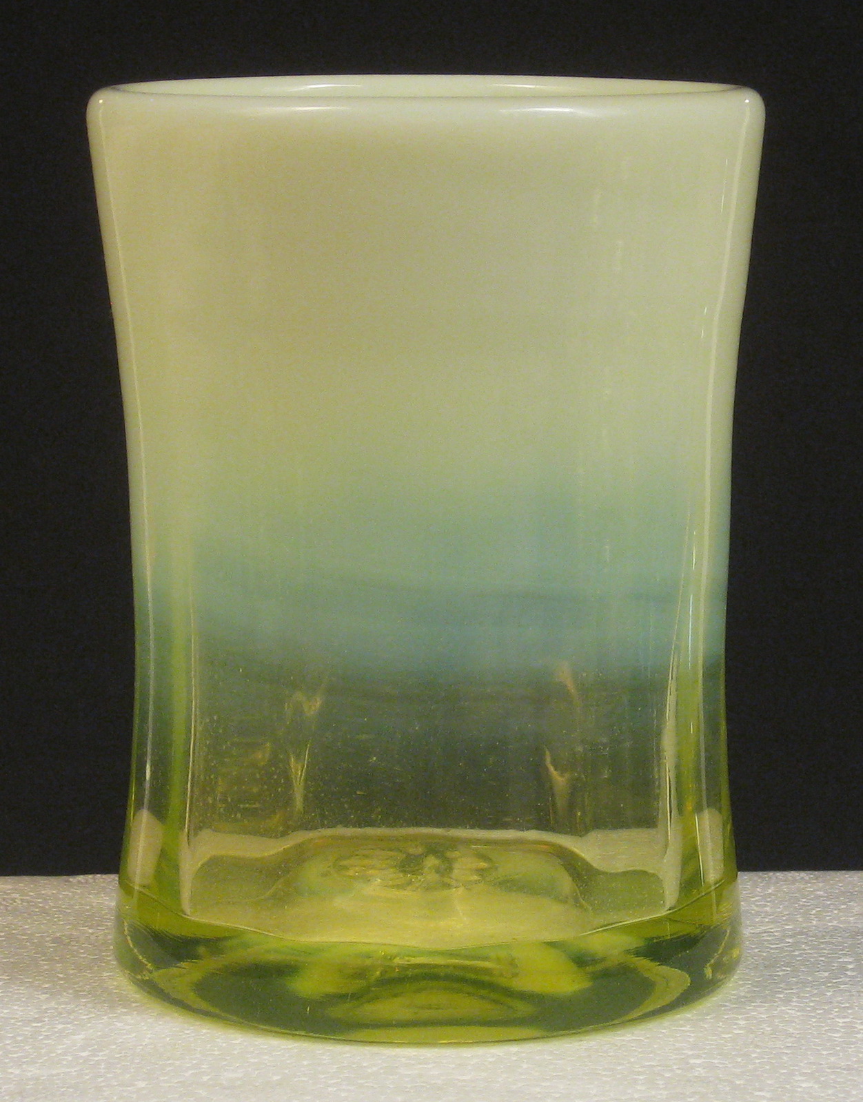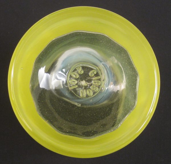 This has great, heavy, Opal on the Vaseline glass (even and over half way down) and has an elegant glass look to it. As with almost all items made by (Charles) Gibson, this is signed and dated…Gibson 2001 in the base.
