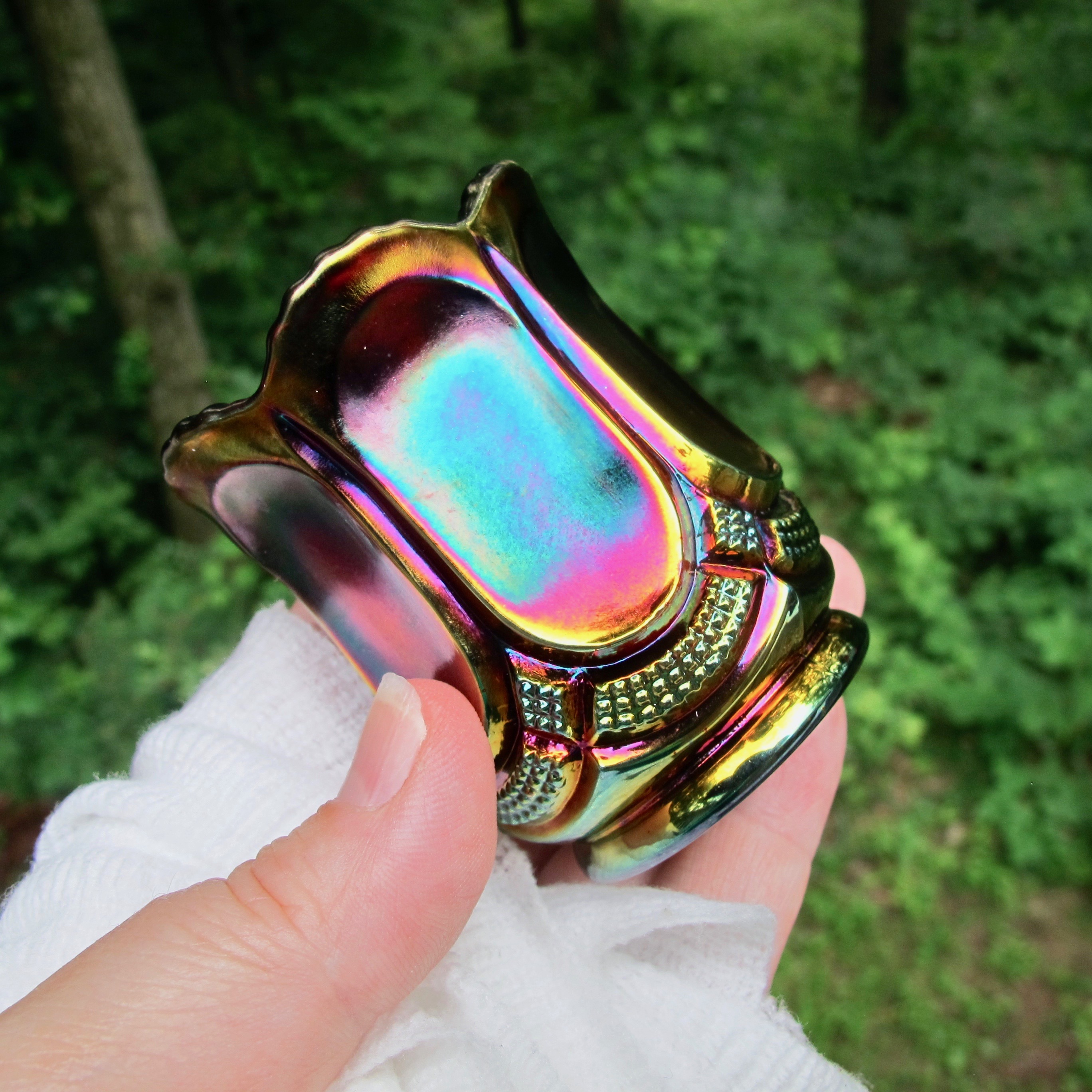 Robert Hansen was a brilliant iridizer of glass and this is a fabulously toothpick! His pieces are not prevalent and are highly collectible! Although I don’t know what year these were made, the Hansen brothers (Robert and Ron) started doing this in the 1960s.