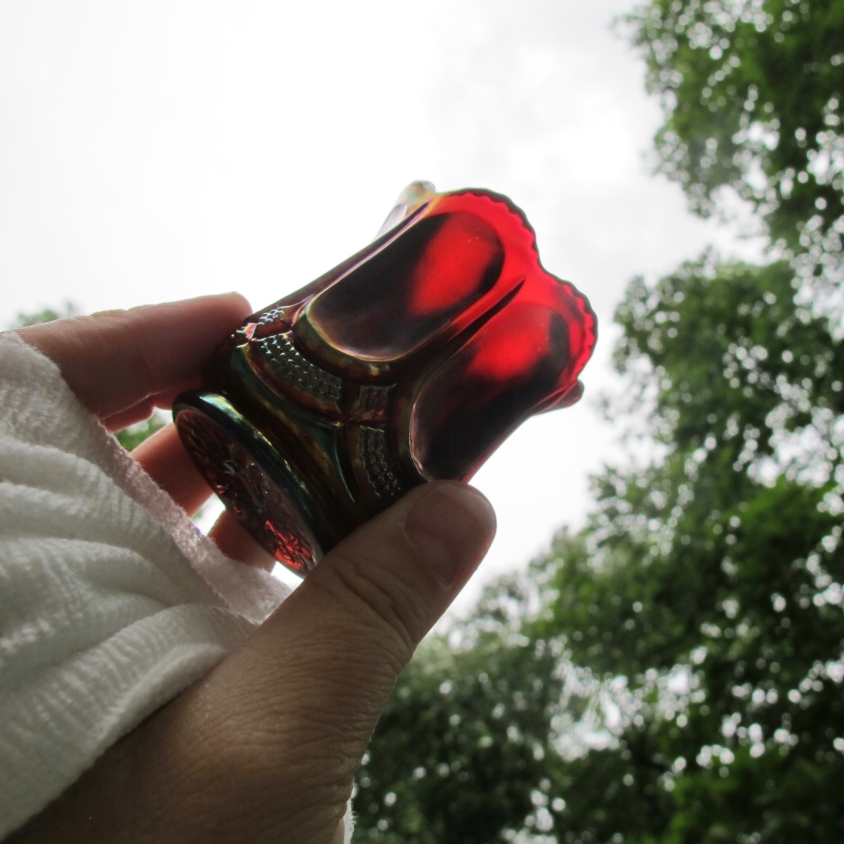 The glass color is RED here. Heard of these in amethyst and even green but not red before.