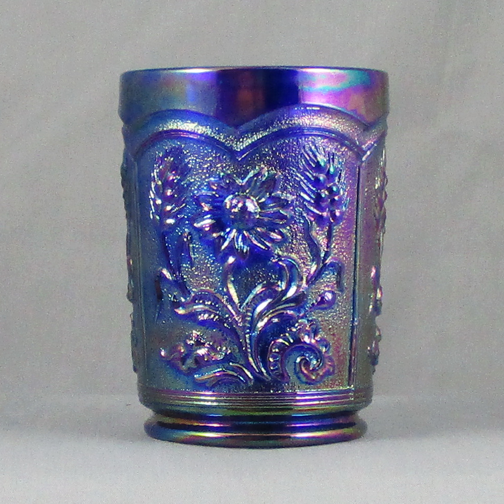 Summit Art Glass FIELDFLOWER Tumbler. This is made using the Imperial mold Vogelsong acquired at the IG Bankruptcy Auction. This is Cobalt Blue Glass. Iridescence on the exterior is very good.