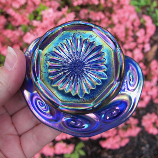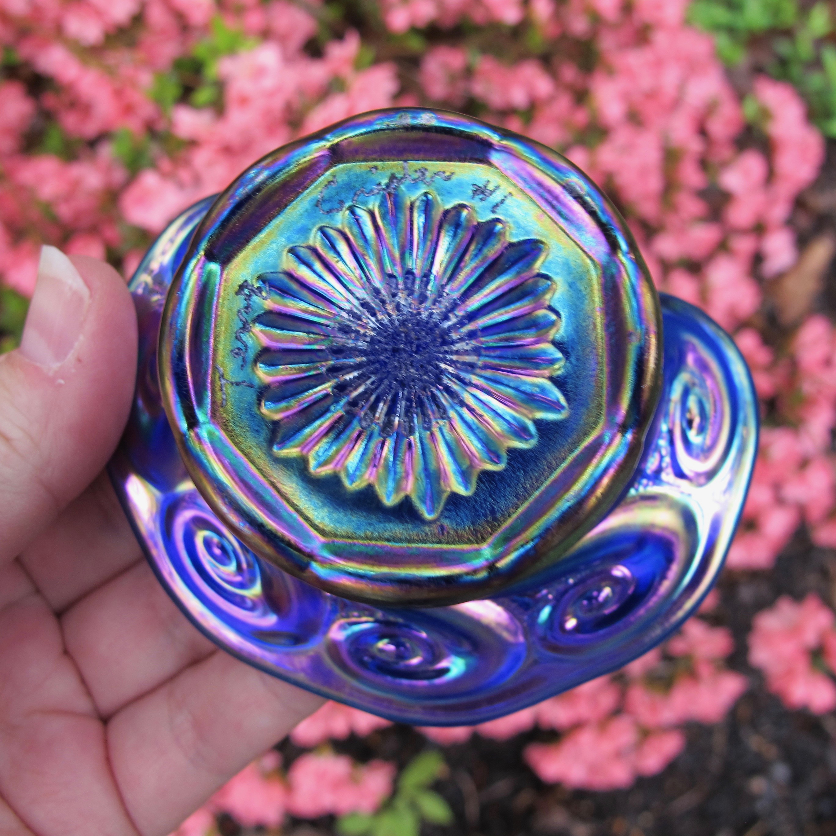 It’s BLUE glass with wonderful YELLOW and BLUE and PINK and AQUA iridescence!! This is a beauty and much better in person than my photos show!