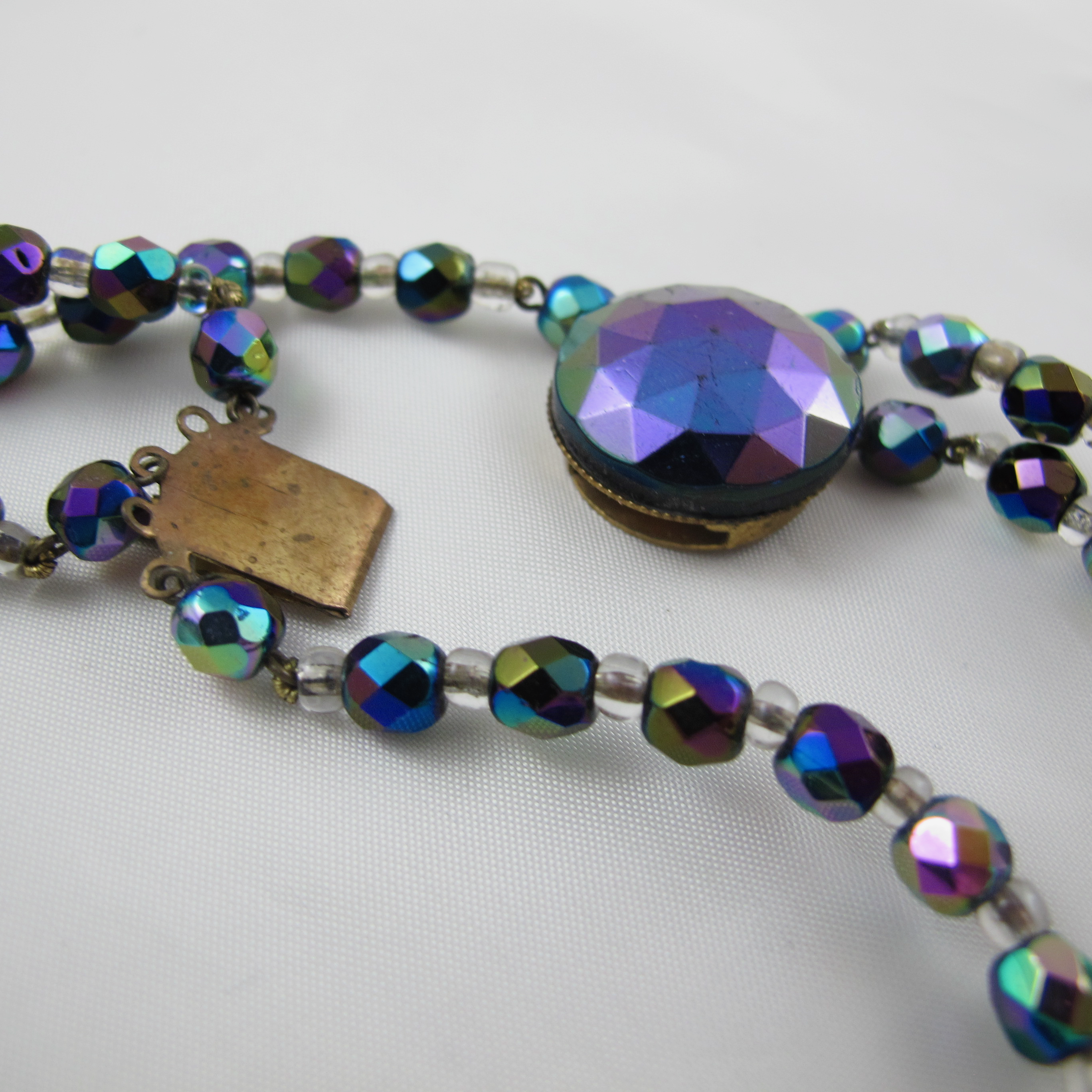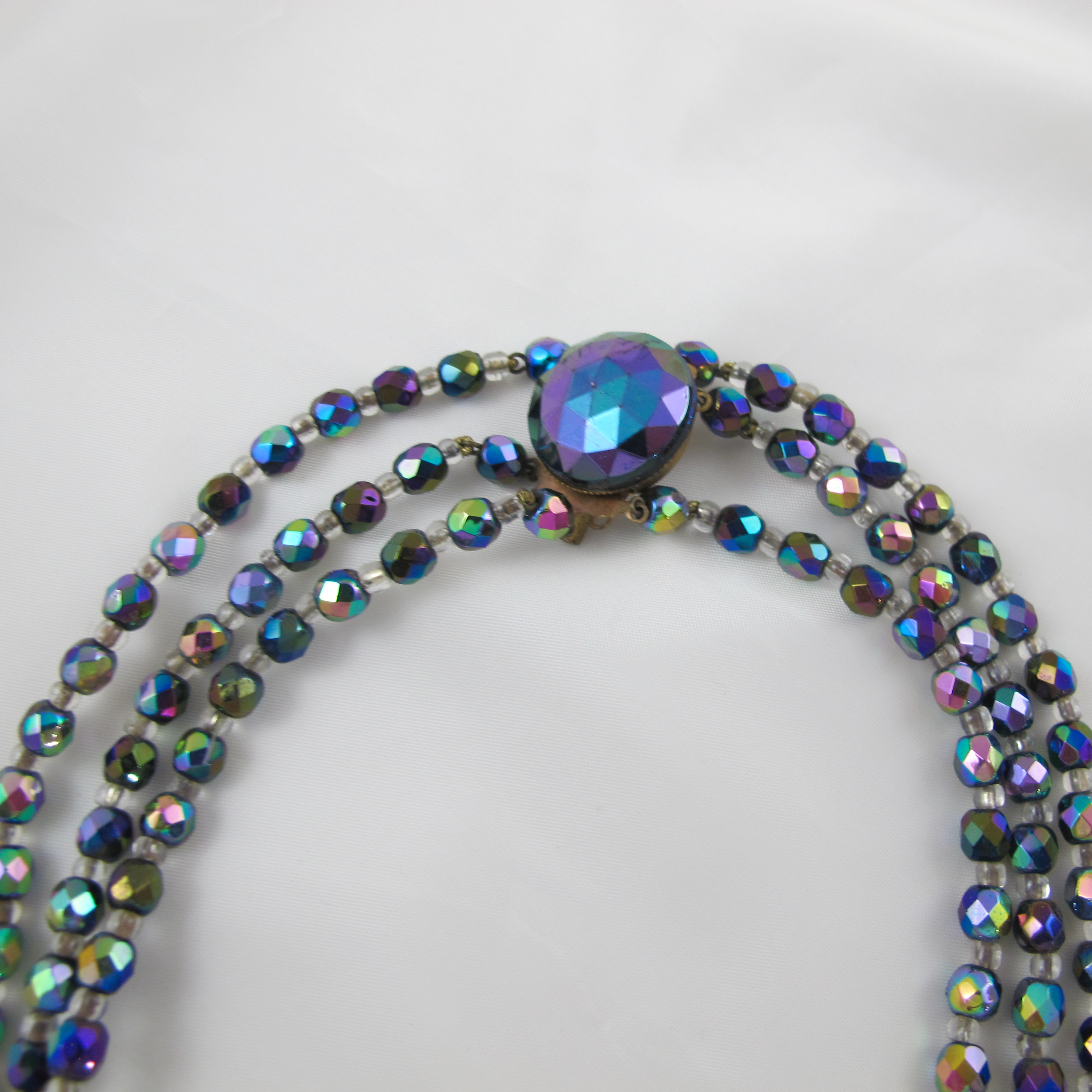 I have no knowledge about vintage or antique jewelry, so I can’t tell you much here BUT I CAN tell you that it is STUNNING! Three beautiful strands with different sized beads! Clear beads in between. I have no idea if this is Austrian or what… but the iridescence is stunning! I don’t think they are glass but they are well made.
